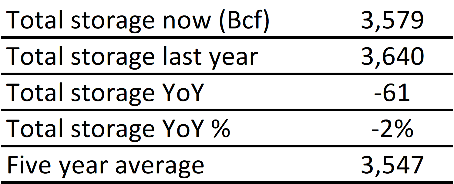 Inventories for the US are now at a deficit of 61 Bcf to last year and a surplus of 32 Bcf to the five-year average. |
