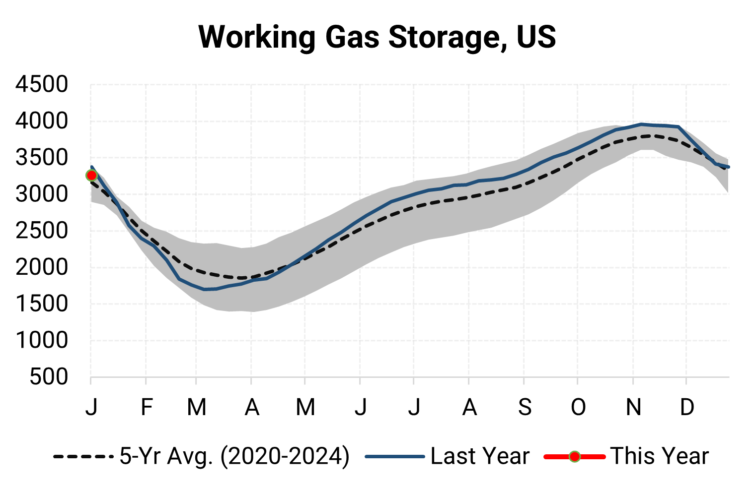 Inventories for the US are now at a deficit of 123 Bcf to last year and a surplus of 31 Bcf to the five-year average. |