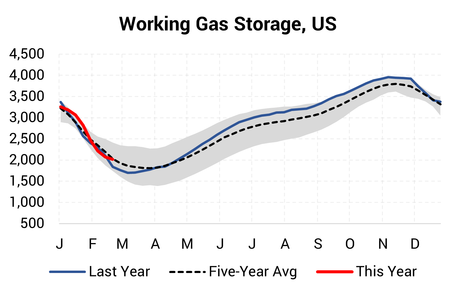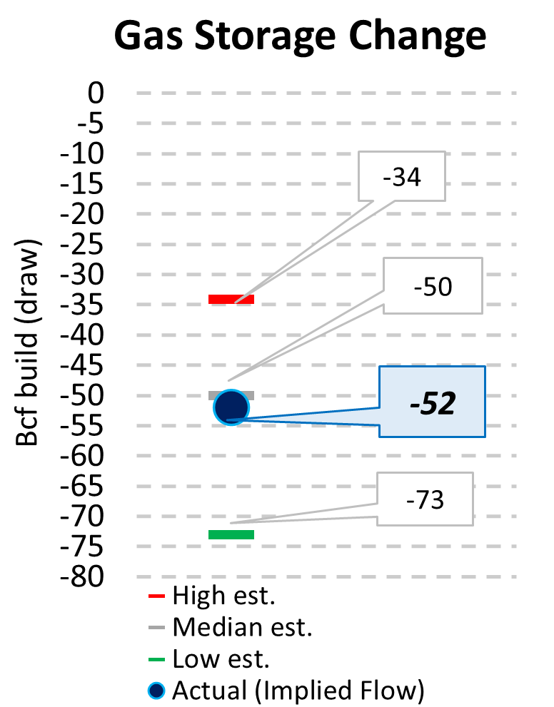 EIA reported a draw of -52 Bcf for the week ending 2/20/2026. This was larger than the median estimate of -50 Bcf. Today's stat fell within the expected range, which was -34 Bcf on the more bearish end, and -73 Bcf on the more bullish end.