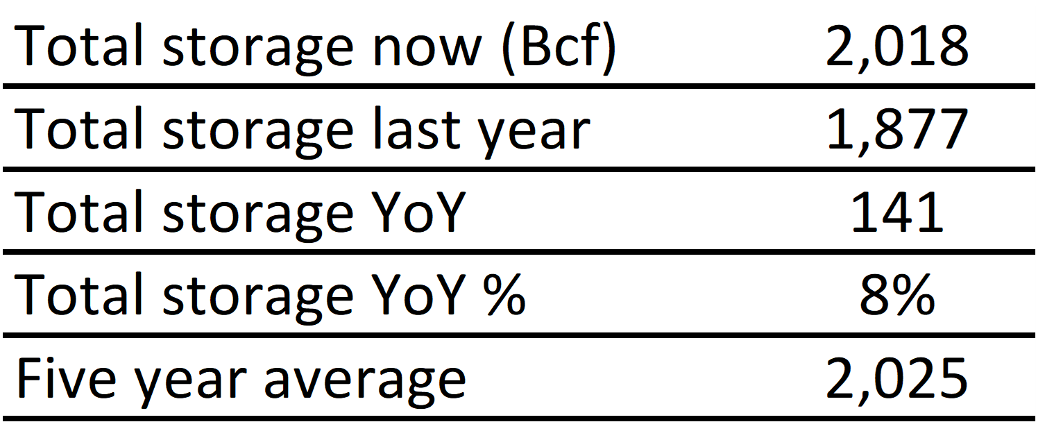 Inventories for the US are now at a surplus of 141 Bcf to last year and a deficit of 7 Bcf to the five-year average. |
