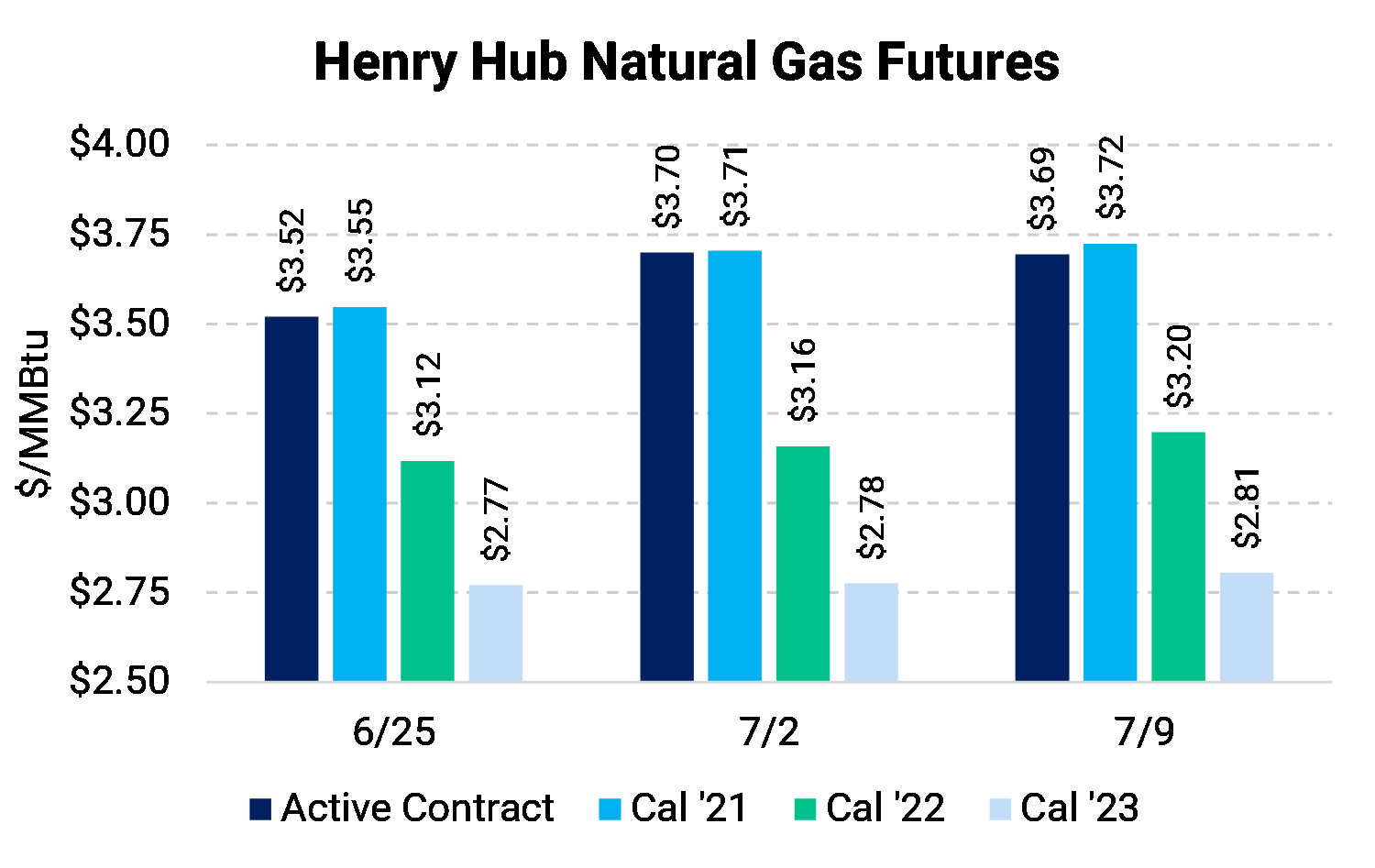 AEGIS hedging recommendations are as follows, for most clients: For the balance of 2021, we suggest using more conservative structures like swaps due to uncertainty in the market. For a Cal 2022, we continue to believe that the inertia is still to the upside from the current strip price of $65.85 for WTI and suggest using more upside-friendly structures like costless collars. Cal 2023 still hovers around $60 due to the curve’s steep backwardation. Costless collars are our default Cal 2023 recommendation for most of our clients due to what we believe is upside potential from current prices.
