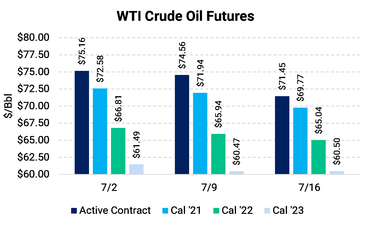 The anticipated agreement would bring a production increase of 400 MBbl/d each month for the remainder of the year. The uncertainty surrounding OPEC+’s cohesion has kept oil prices range-bound and volatile in the US, with WTI trading between $76.96 and $70.43 for the past two weeks.