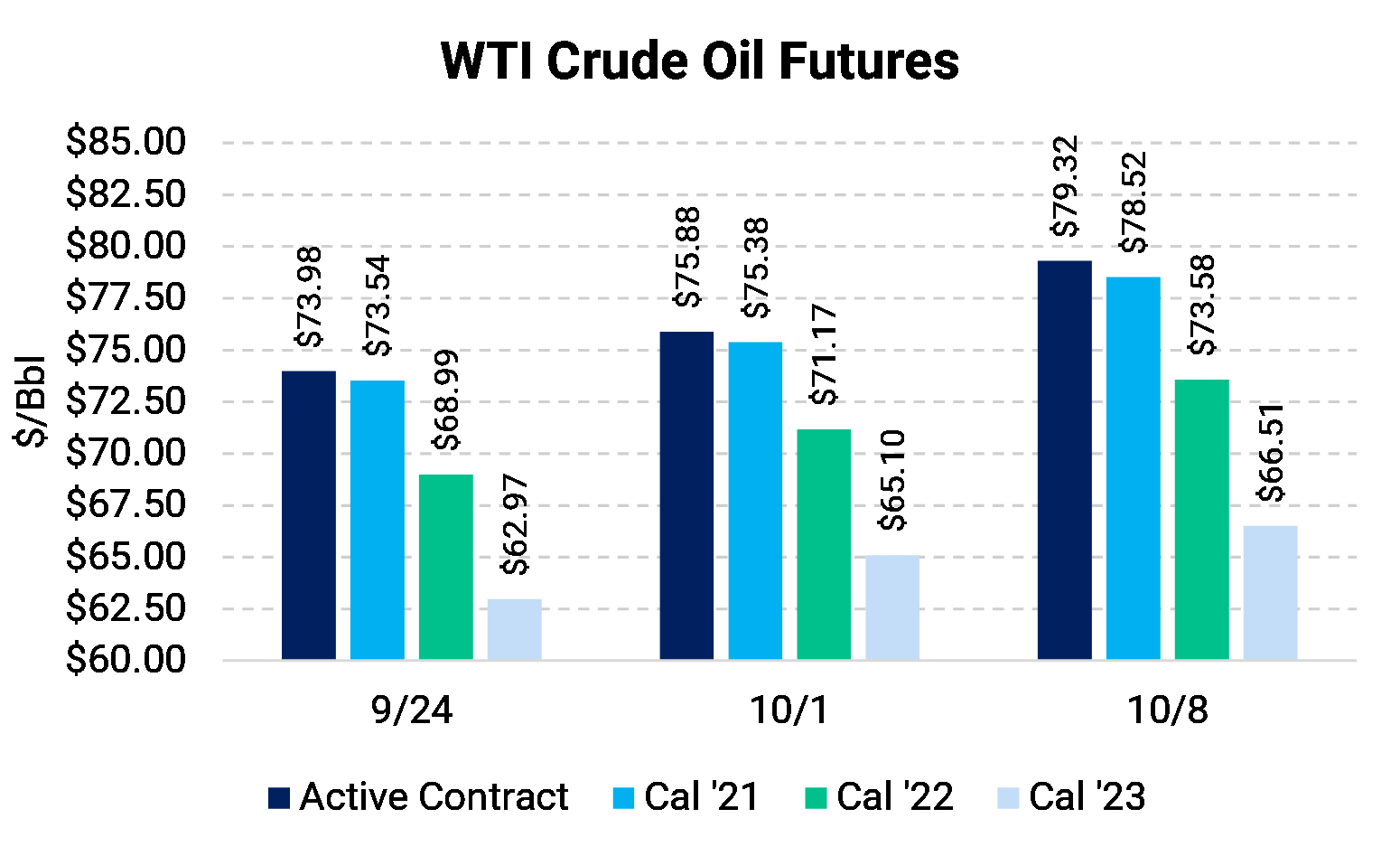 West Texas Intermediate traded above $80/Bbl for the first time since 2014 this week. Bullish sentiment has lifted oil prices by over $10/Bbl in the past month. The latest uptick comes as the globe moves past the demand impact from the COVID Delta variant, and OPEC+ confirmed a slow drip of production increases into a market hungry for supply. The optimism surrounding WTI can be seen in the options market, where call options (which pay out if prices rise) were much more bid than put options (which pay if prices fall). What had been “put skew” briefly switched to a small “call skew” on Friday. The call skew is uncommon, and it's a benefit to producers. Those who have considered using costless collars may want to take another look, as this phenomenon makes collars more beneficial.