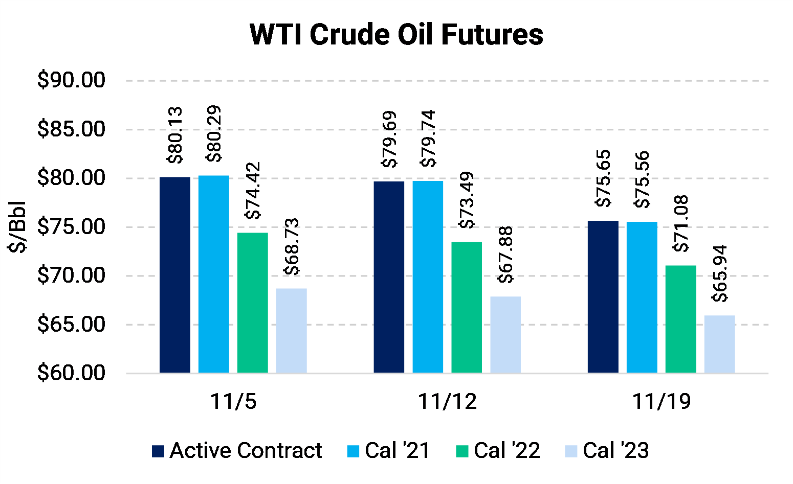 Oil prices came under heavy selling pressure during the week, settling at $76.10/Bbl, down $2.91, on Friday. The Biden Administration has continued to threaten government intervention to lower fuel prices. Also, Covid cases in Europe surged, increasing the chances of more mobility restrictions.