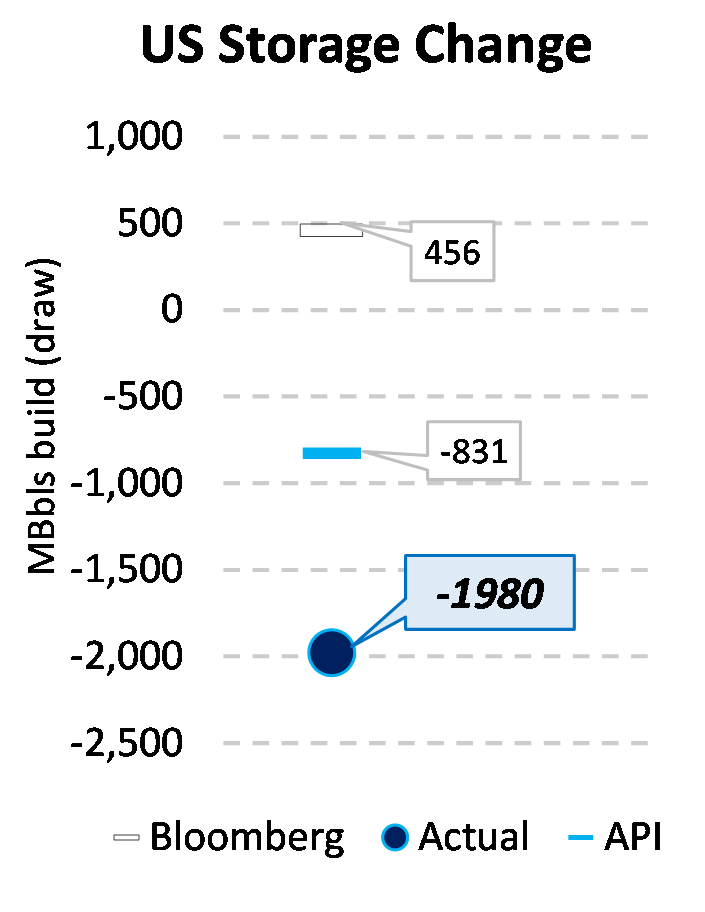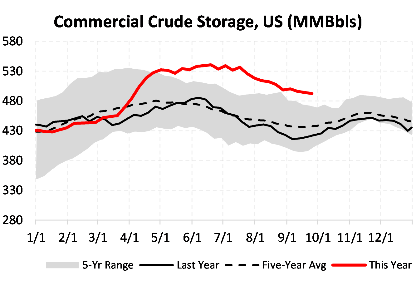 EIA reported a draw of -1980 MBbls in U.S. crude-oil inventories for the week ending 9/25/2020. This was larger than the average estimate of 456 MBbls as reported by Bloomberg.