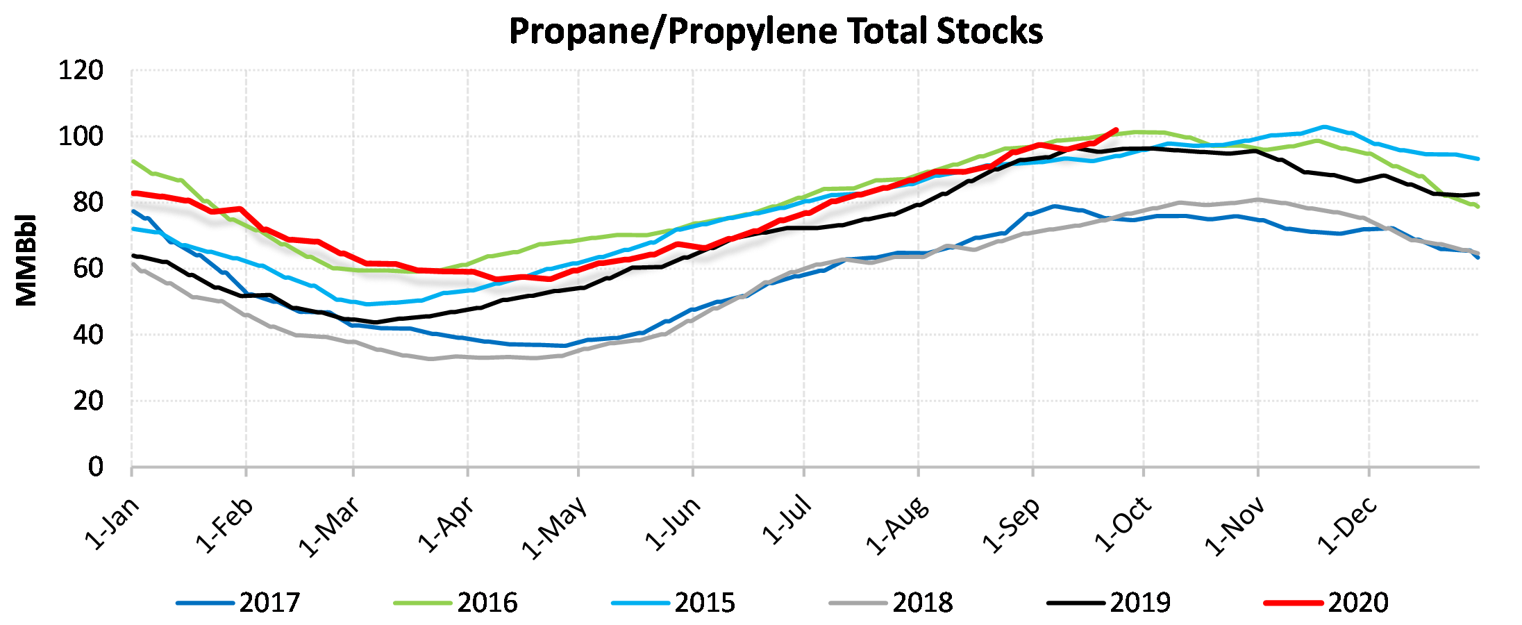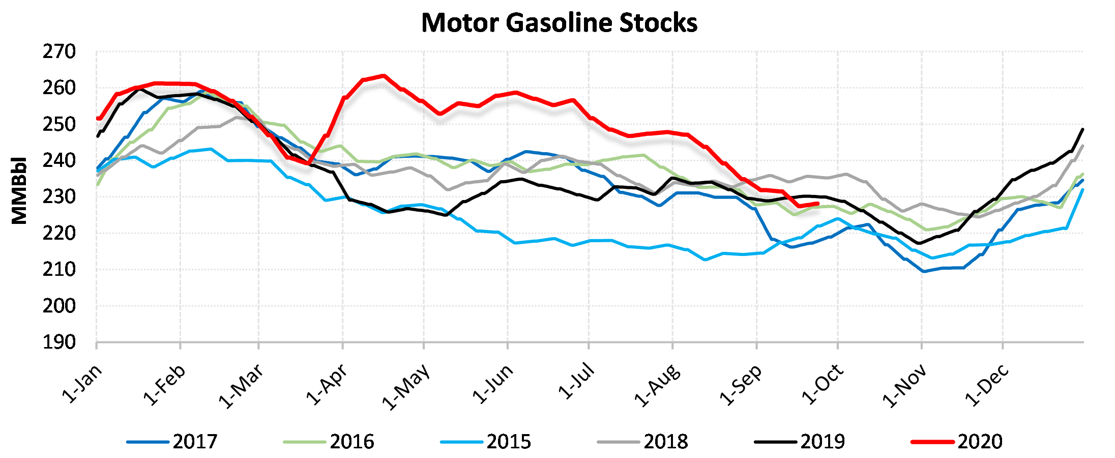 Inventories for the US are now at a surplus of 72.888 MBbls to last year and a surplus of 55.51 MBbls to the five-year average.