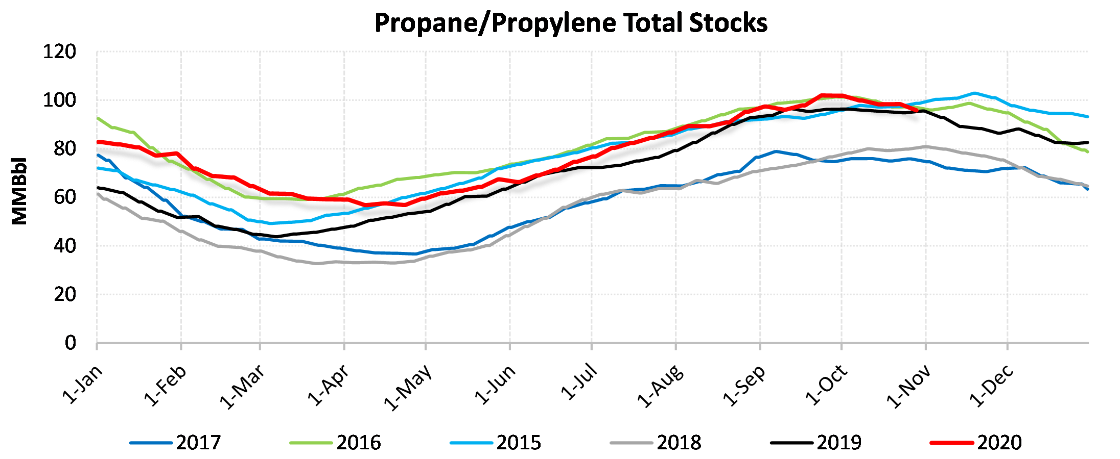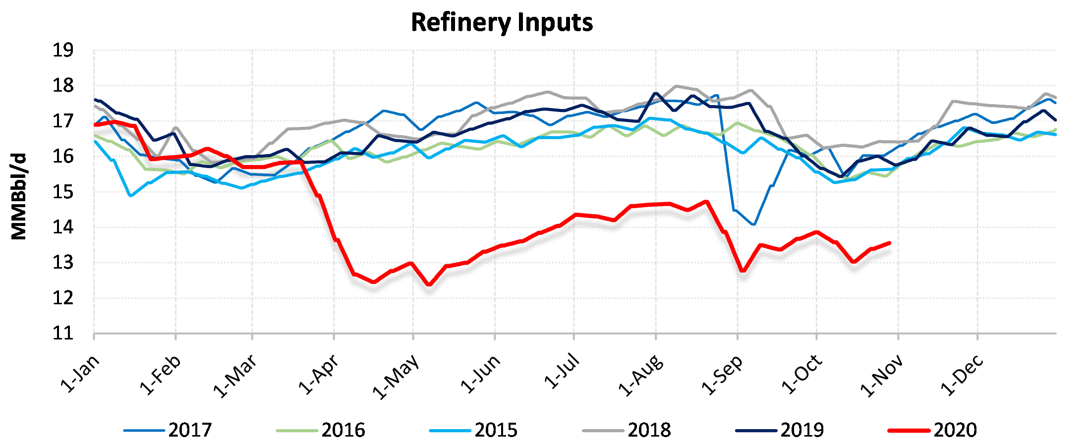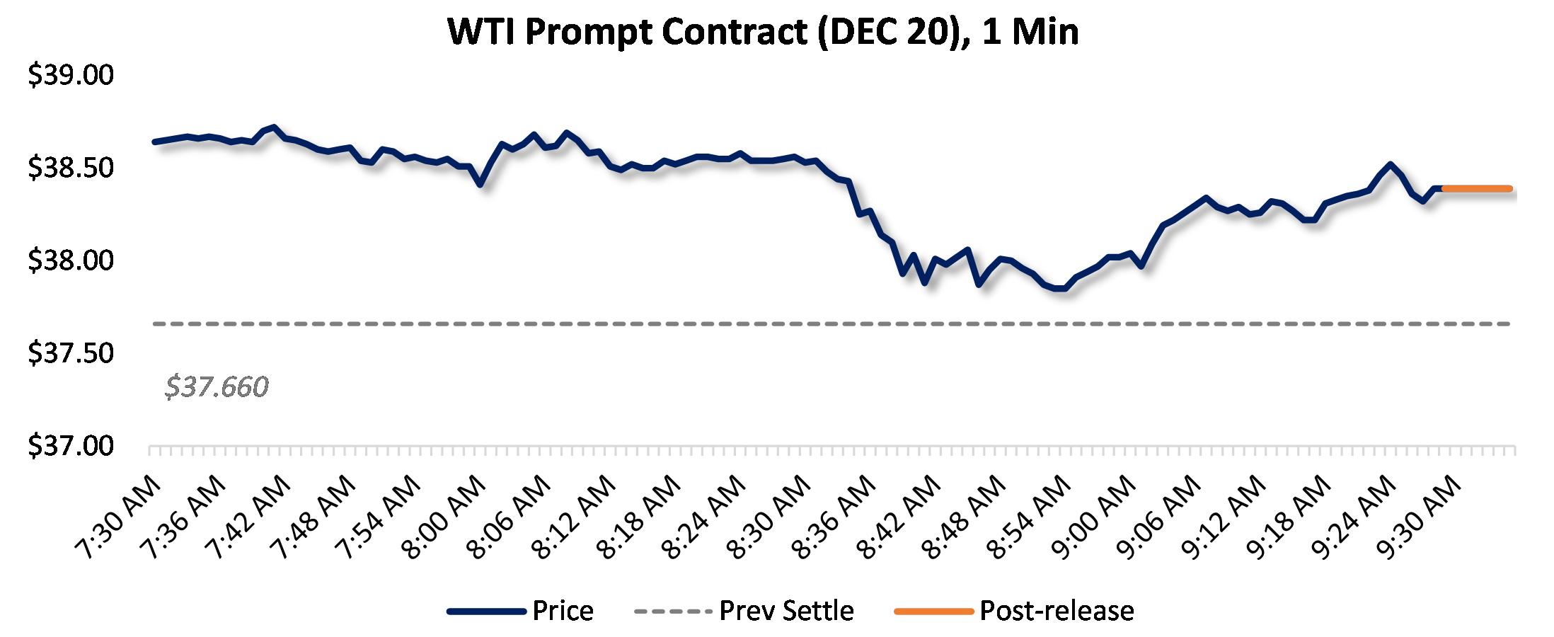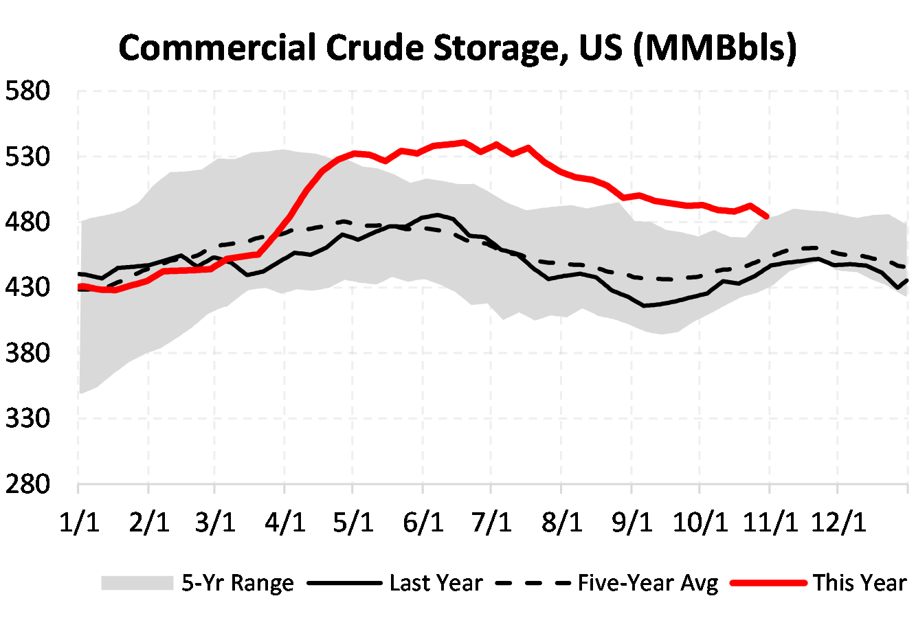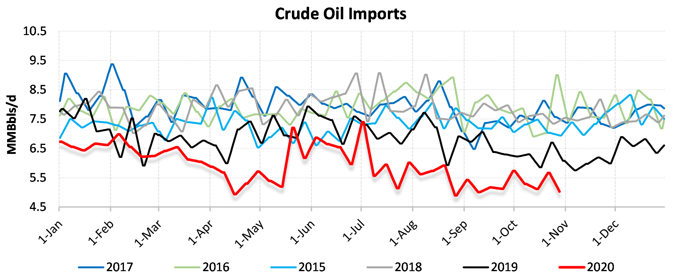 EIA reported a draw of -7998 MBbls in U.S. crude-oil inventories for the week ending 10/30/2020. This was larger than the average estimate of 581 MBbls as reported by Bloomberg.