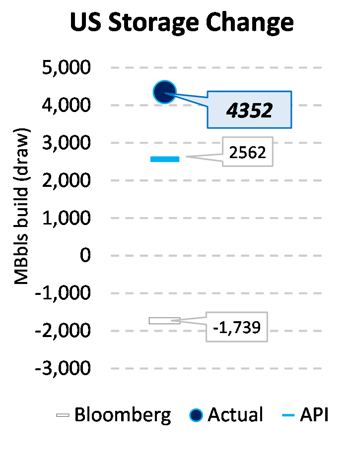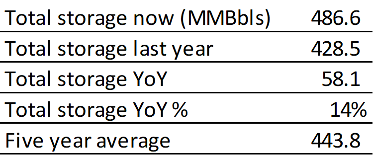 Inventories for the US are now at a surplus of 58.052 MBbls to last year and a surplus of 42.79 MBbls to the five-year average.