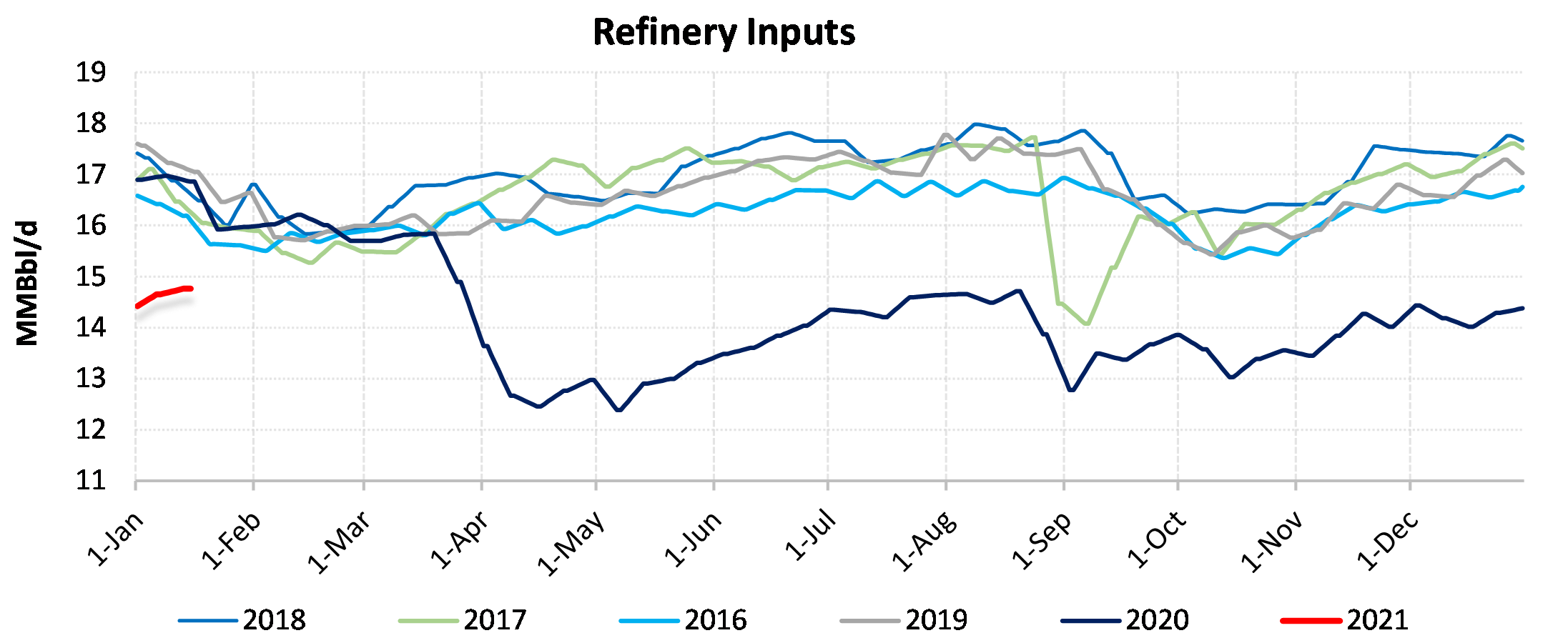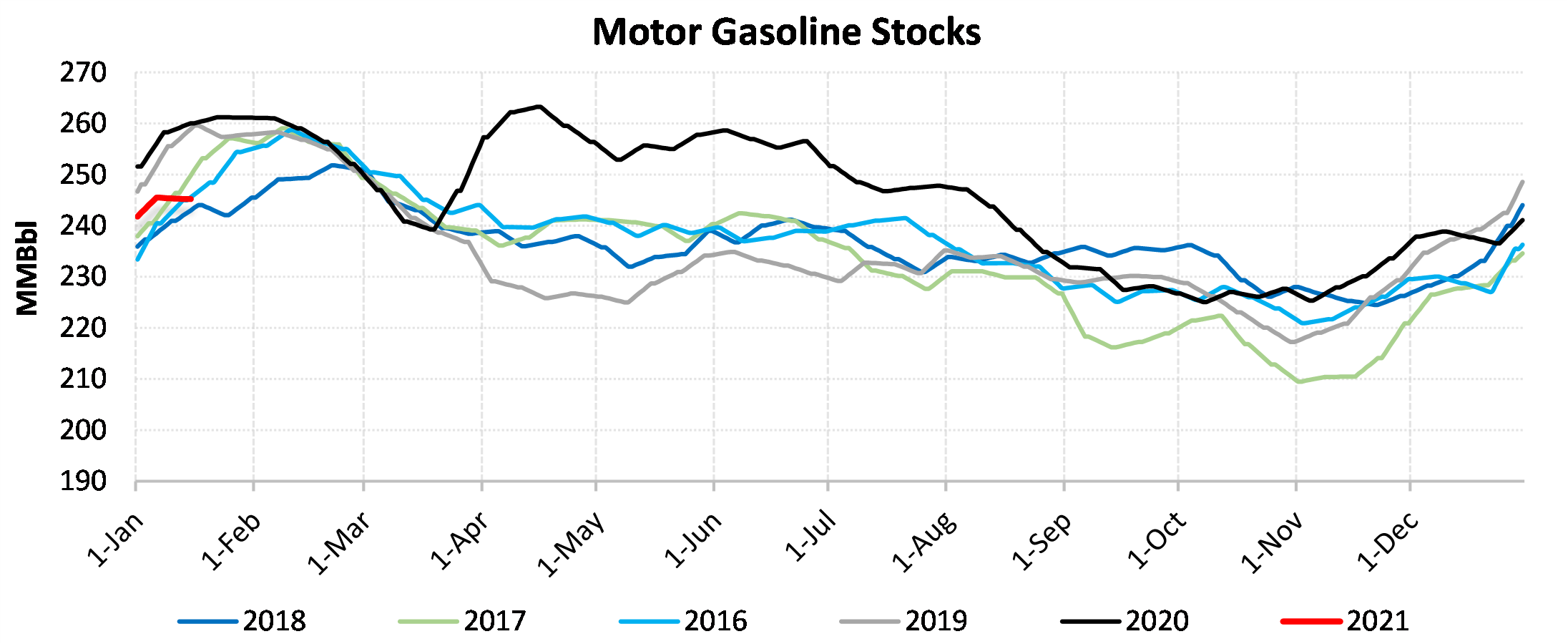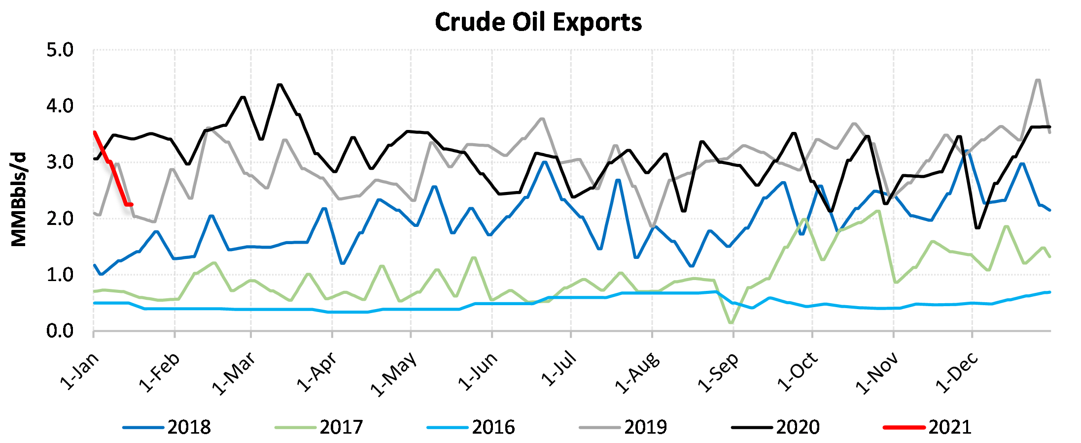 EIA reported a build of 4352 MBbls in U.S. crude-oil inventories for the week ending 1/15/2021. This was larger than the average estimate of -1739 MBbls as reported by Bloomberg.