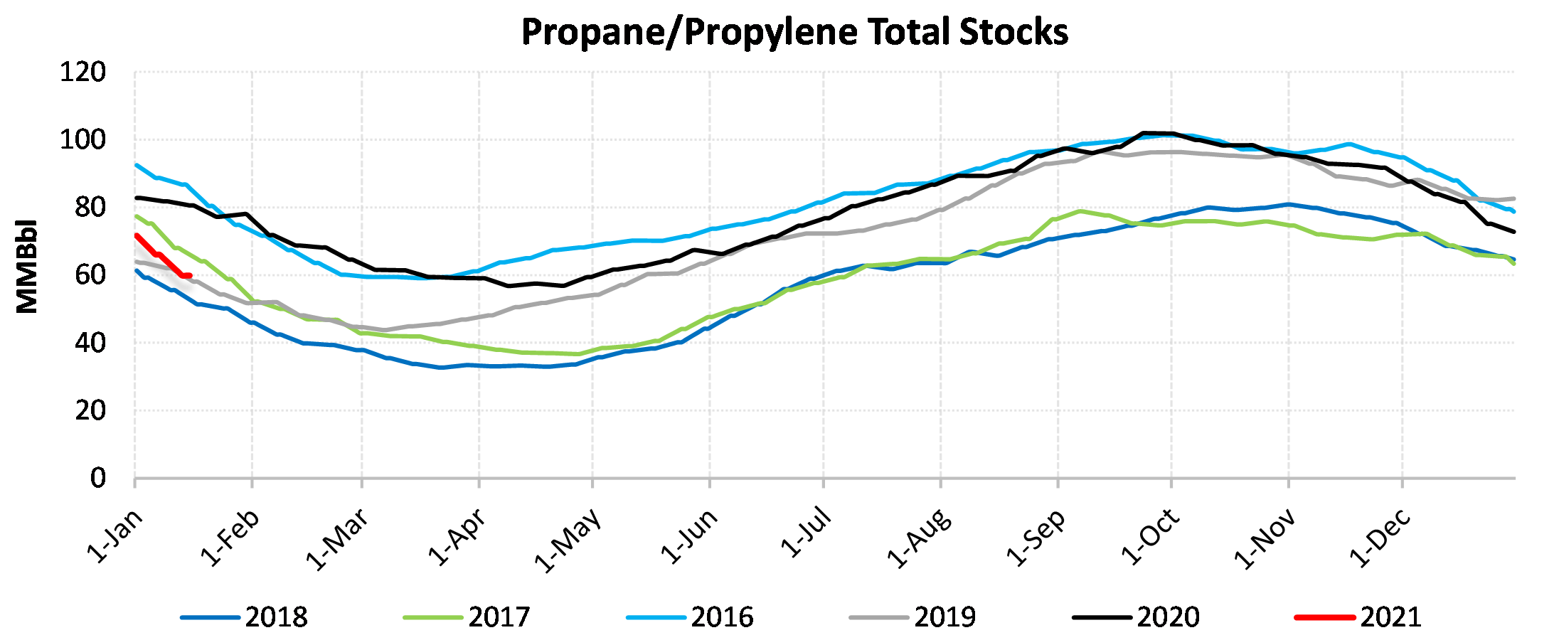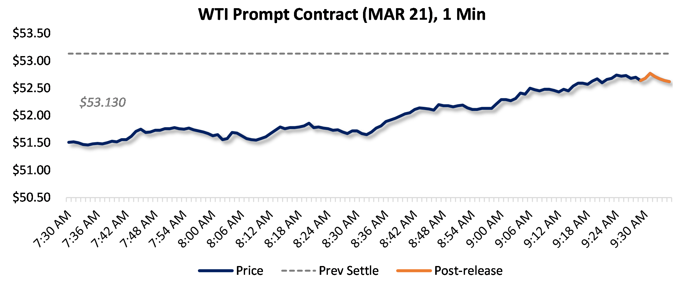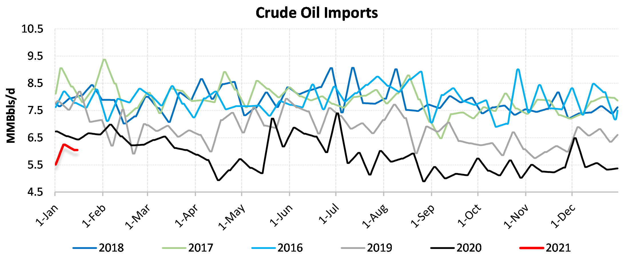 EIA reported a build of 4352 MBbls in U.S. crude-oil inventories for the week ending 1/15/2021. This was larger than the average estimate of -1739 MBbls as reported by Bloomberg.