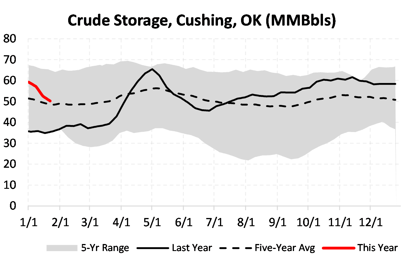 Inventories for the US are now at a surplus of 48.547 MBbls to last year and a surplus of 29.34 MBbls to the five-year average.