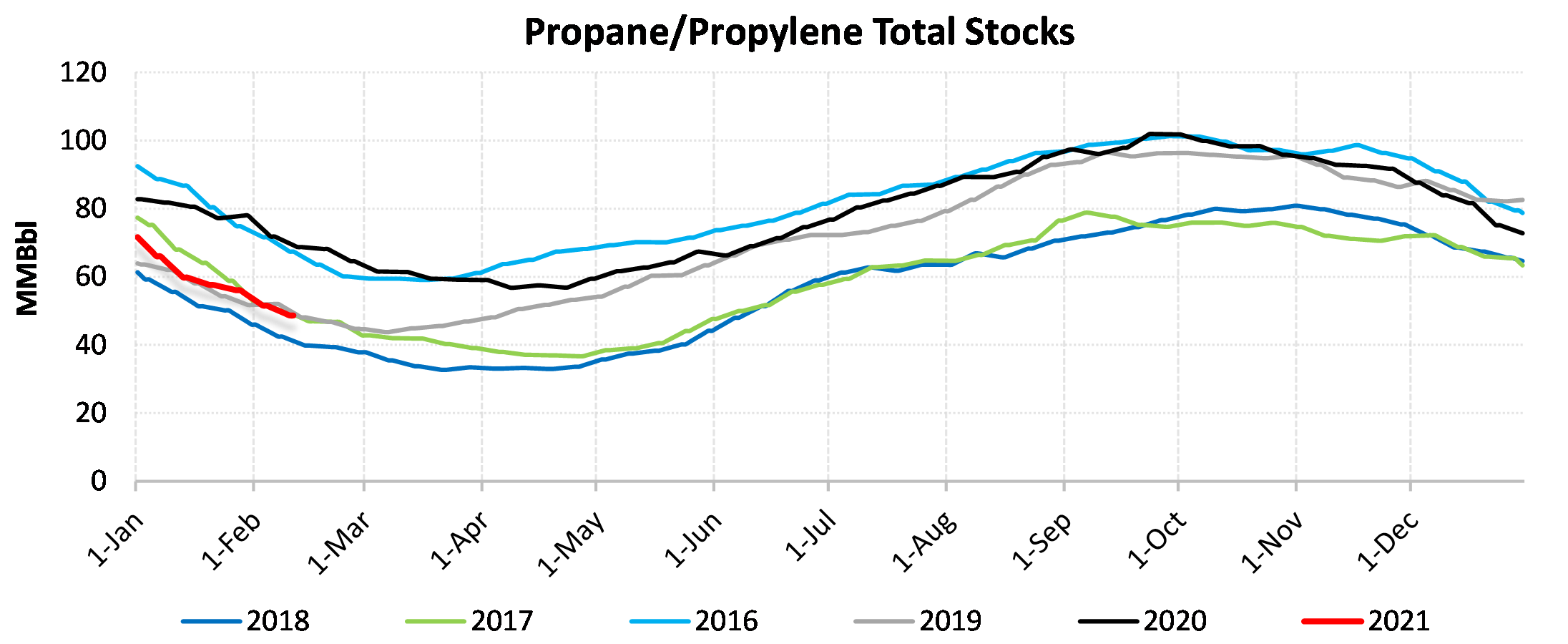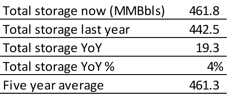 Inventories for the US are now at a surplus of 19.289 MBbls to last year and a surplus of 0.49 MBbls to the five-year average.