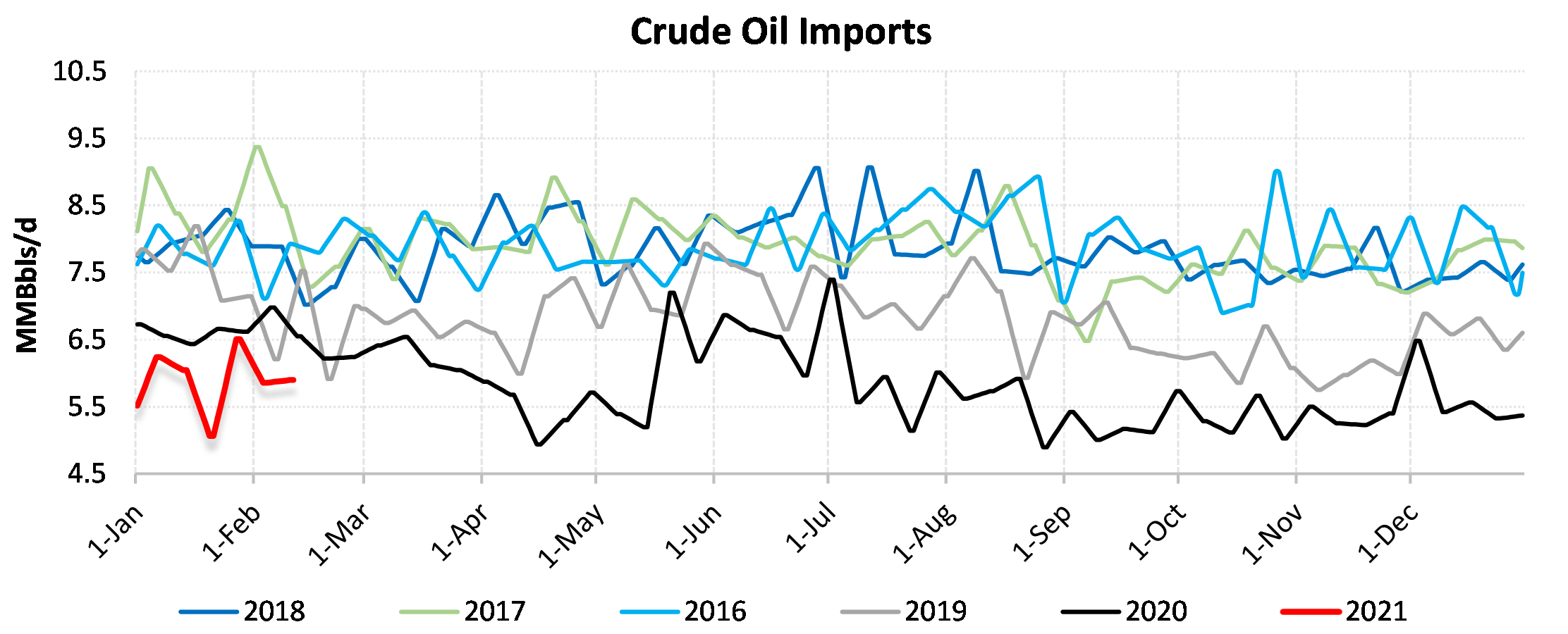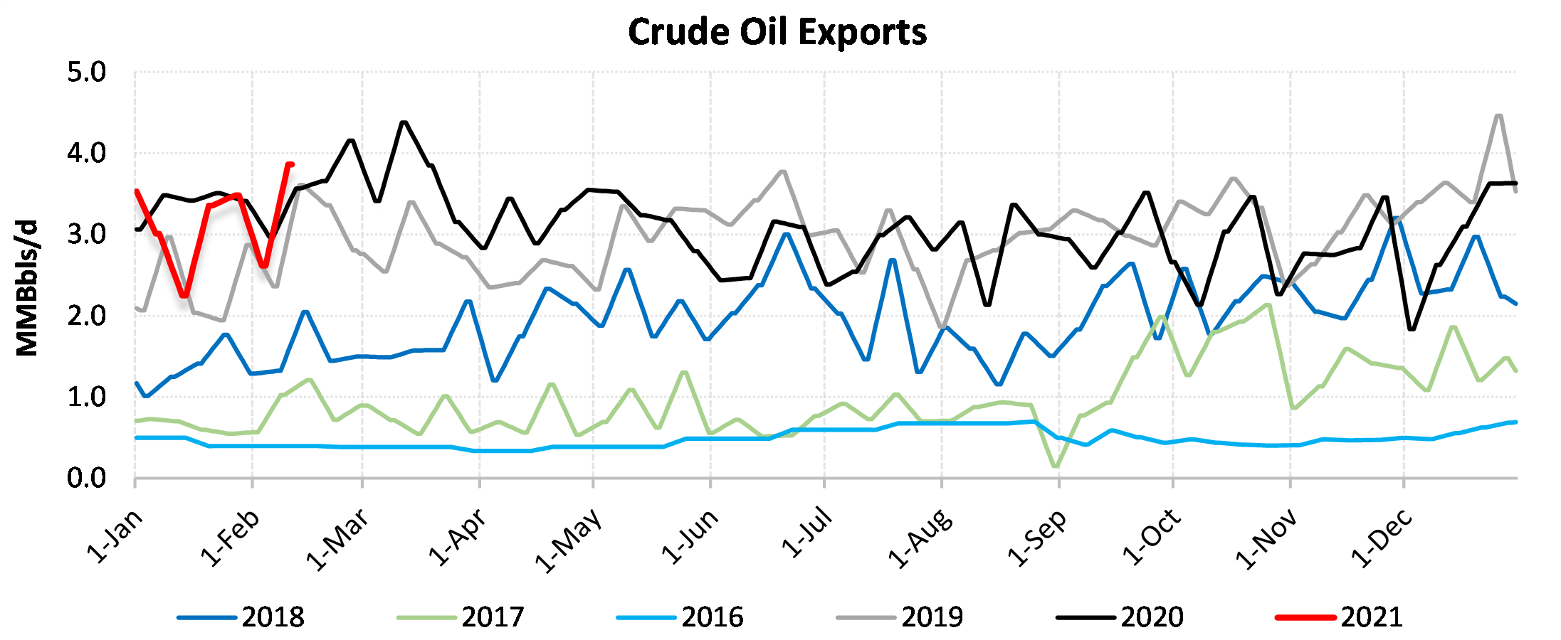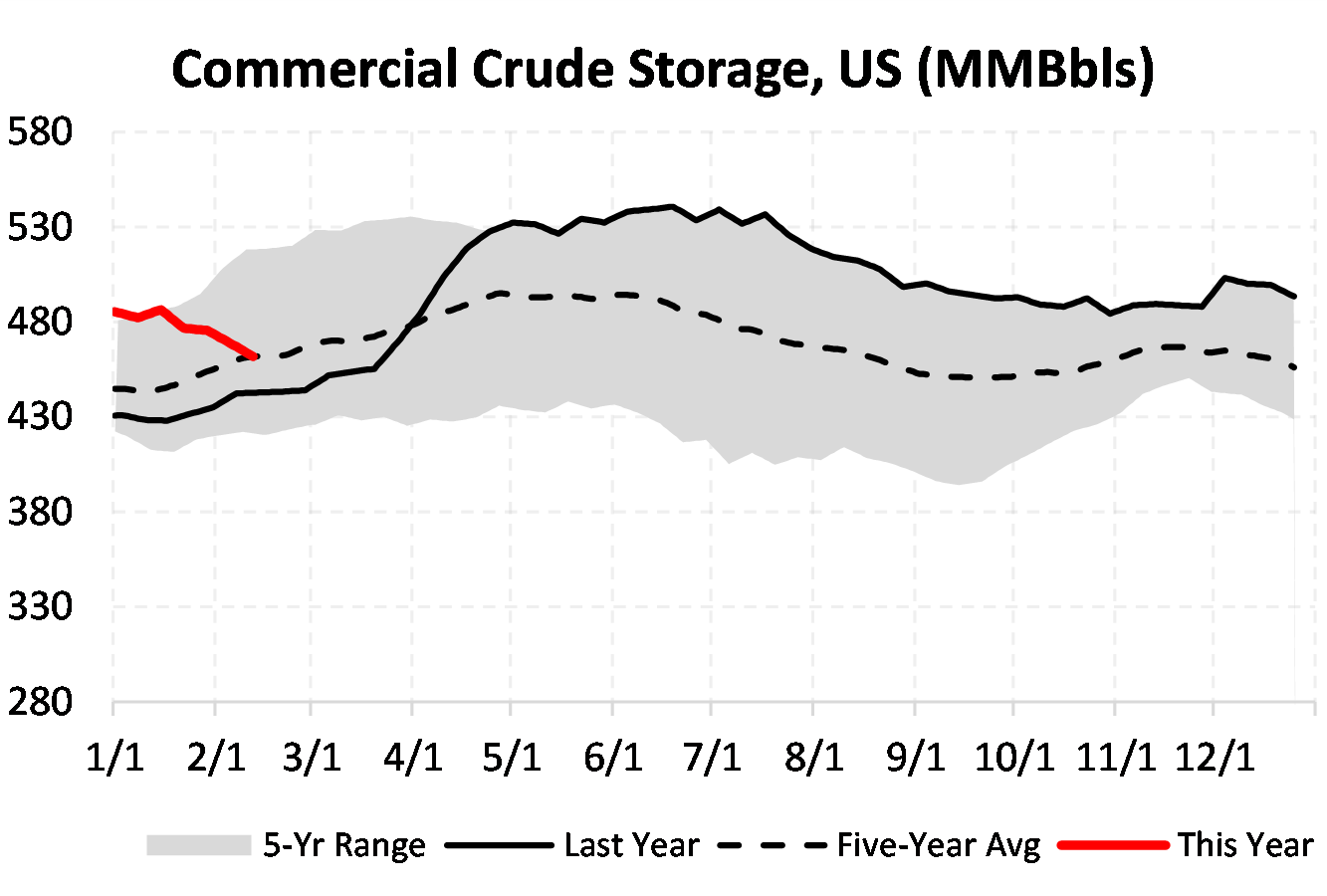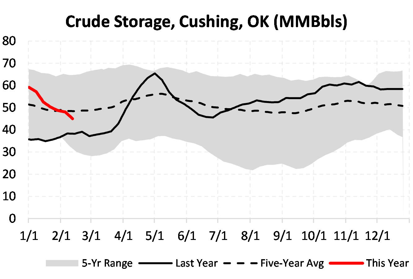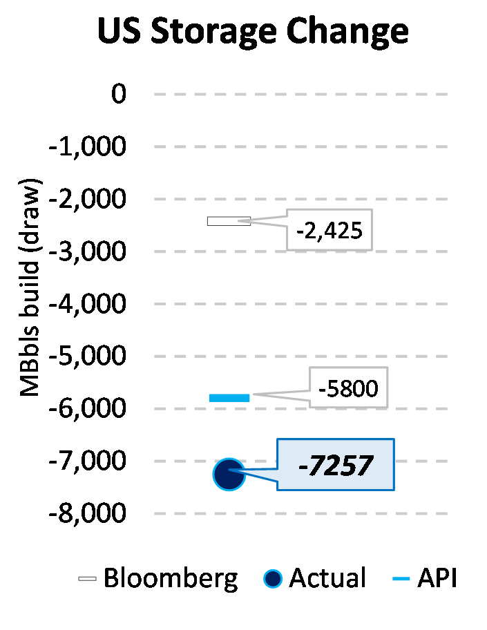 EIA reported a draw of -7257 MBbls in U.S. crude-oil inventories for the week ending 2/12/2021. This was larger than the average estimate of -2425 MBbls as reported by Bloomberg.