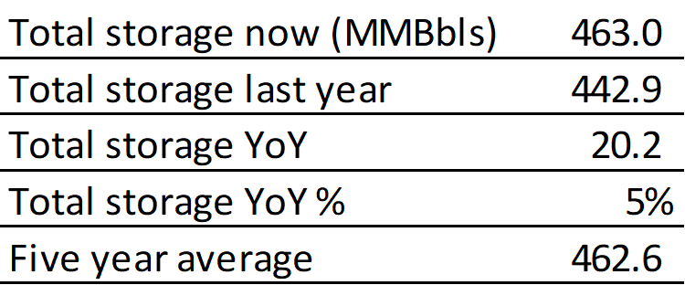 Inventories for the US are now at a surplus of 20.159 MBbls to last year and a surplus of 0.47 MBbls to the five-year average.