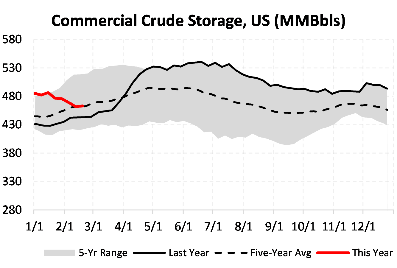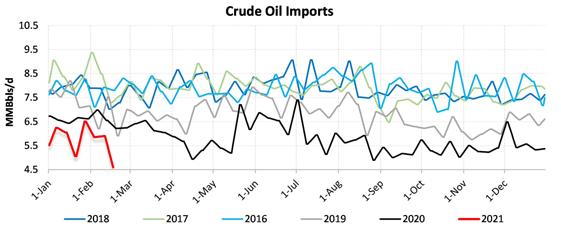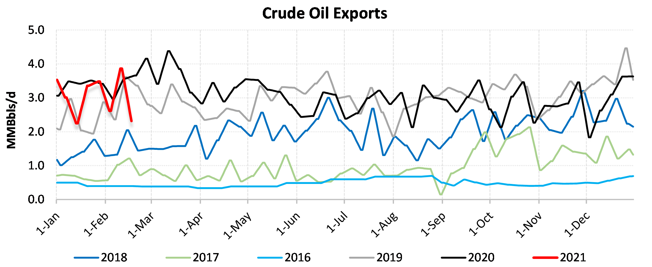EIA reported a build of 1285 MBbls in U.S. crude-oil inventories for the week ending 2/19/2021. This was smaller than the average estimate of -6742 MBbls as reported by Bloomberg.