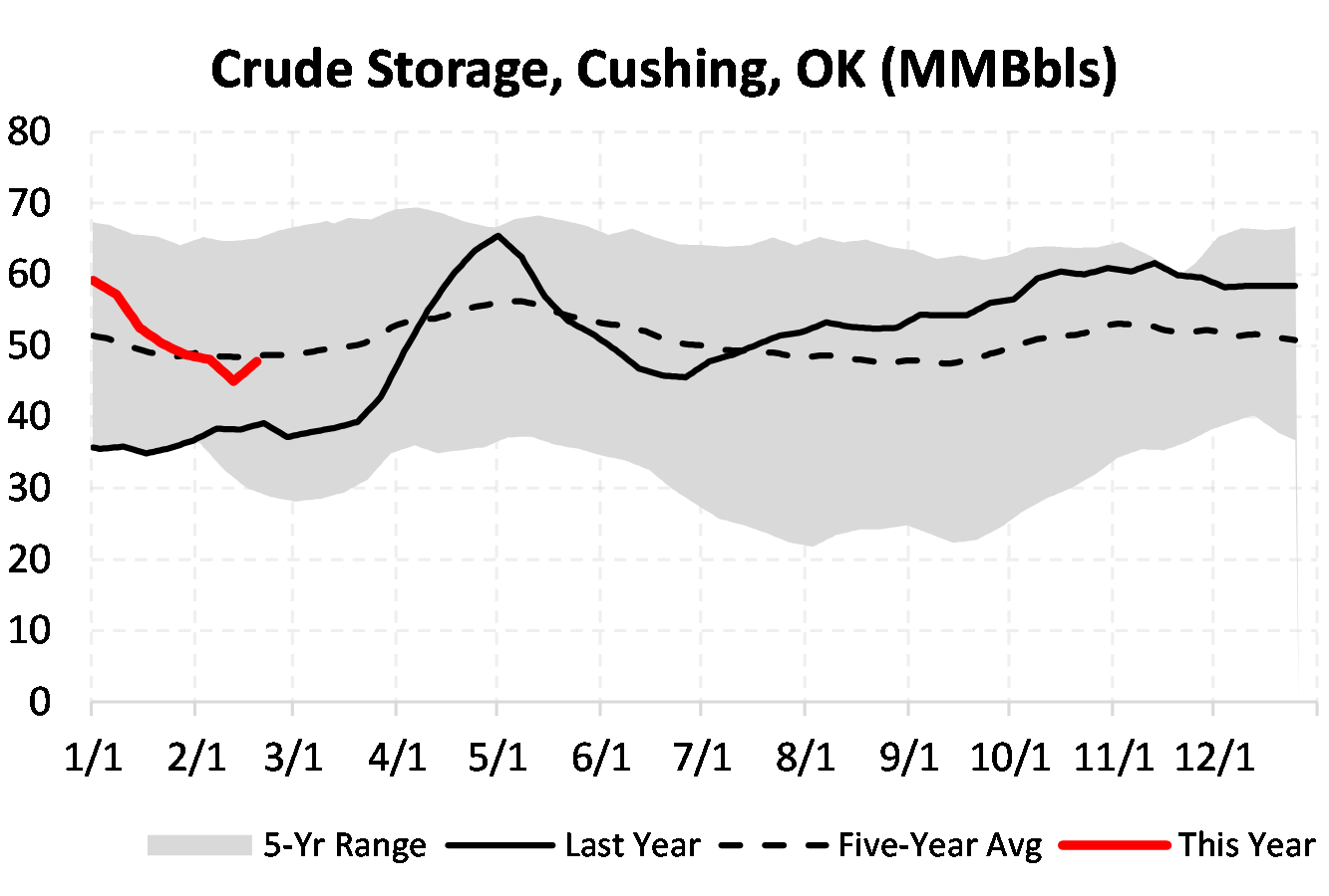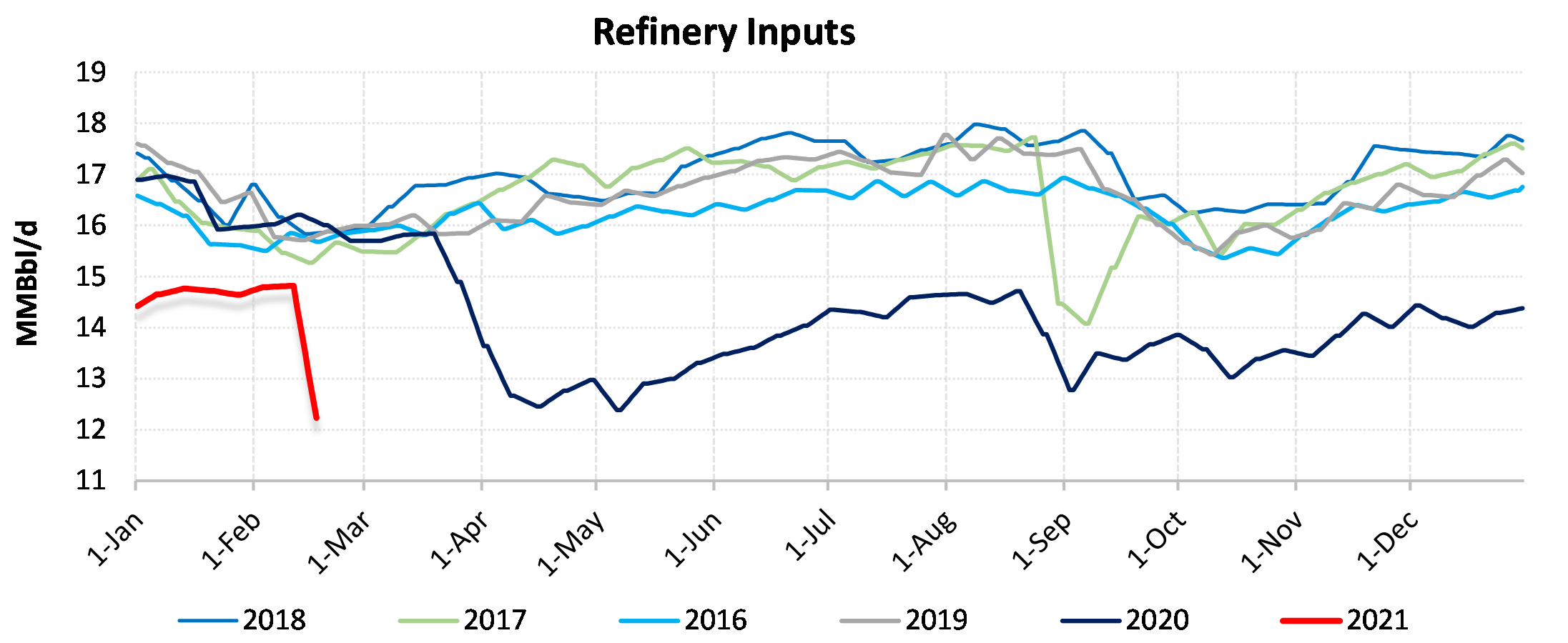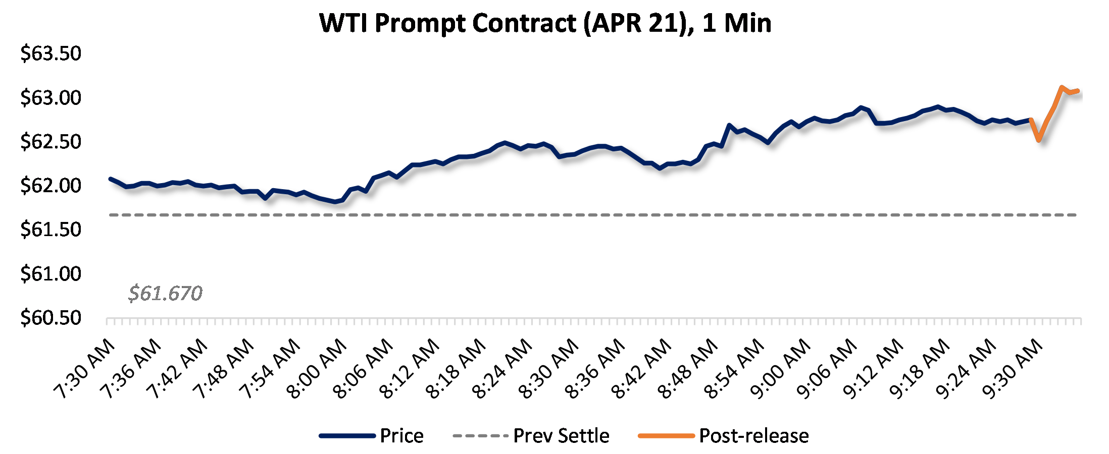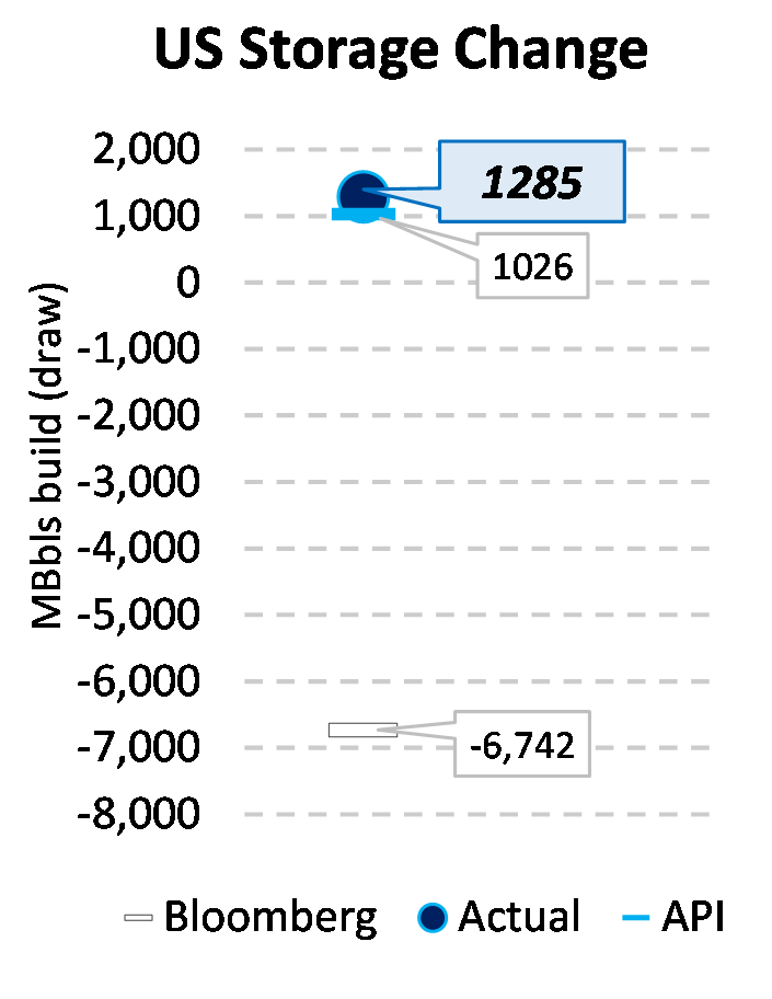 EIA reported a build of 1285 MBbls in U.S. crude-oil inventories for the week ending 2/19/2021. This was smaller than the average estimate of -6742 MBbls as reported by Bloomberg.
