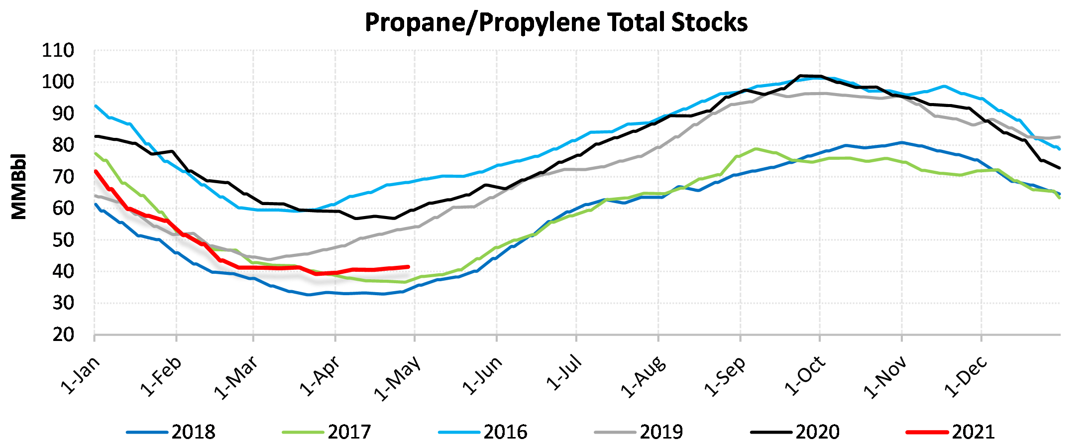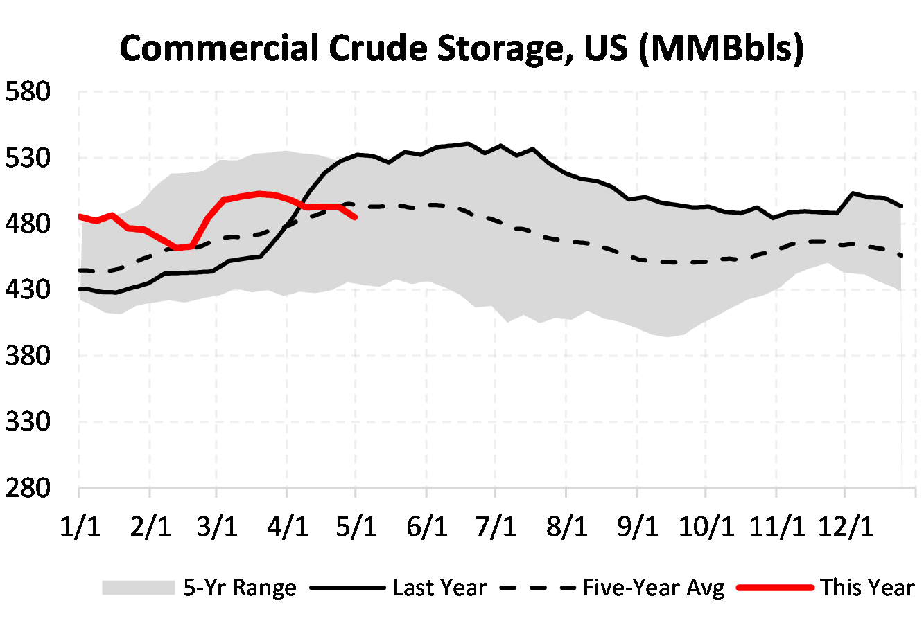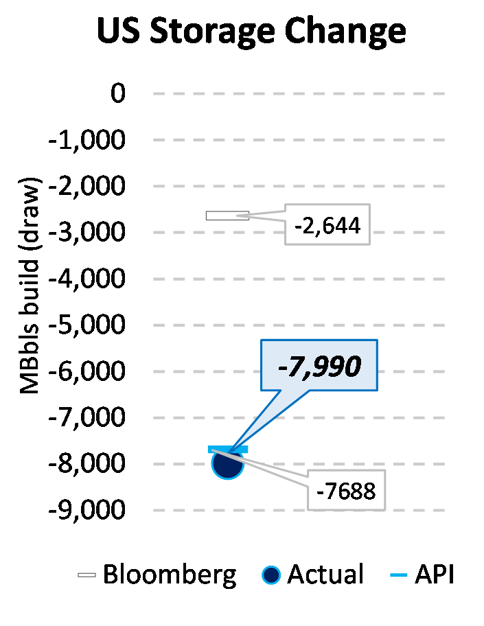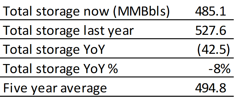 Inventories for the US are now at a deficit of 42.514 MBbls to last year and a deficit of 9.69 MBbls to the five-year average.
