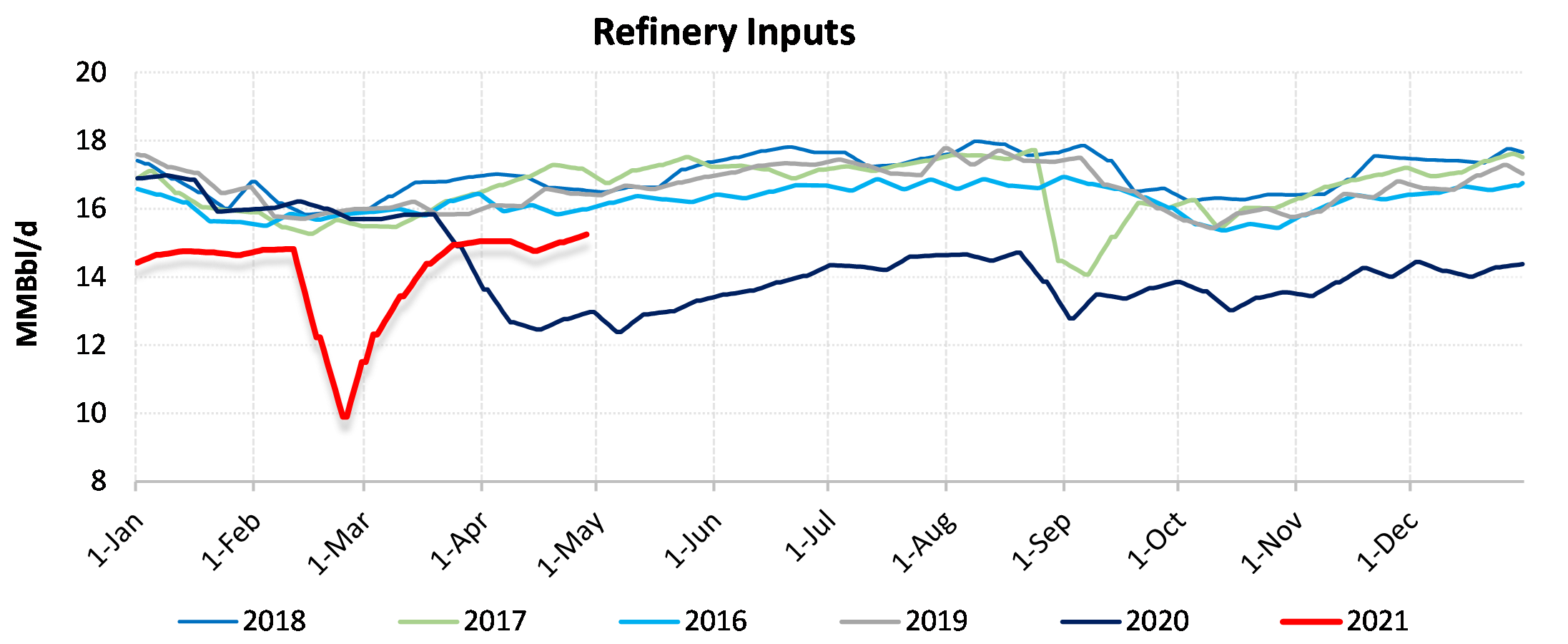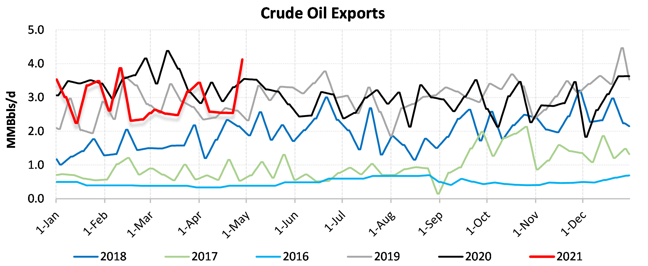 EIA reported a draw of -7990 MBbls in U.S. crude-oil inventories for the week ending 4/30/2021. This was larger than the average estimate of -2644 MBbls as reported by Bloomberg.