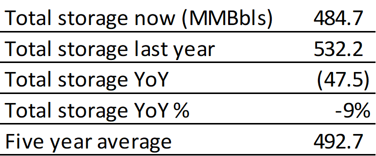Inventories for the US are now at a deficit of 47.53 MBbls to last year and a deficit of 8.03 MBbls to the five-year average.