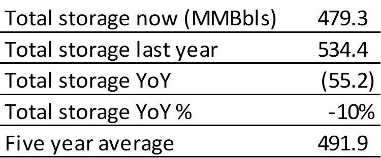 Inventories for the US are now at a deficit of 55.152 MBbls to last year and a deficit of 12.64 MBbls to the five-year average.