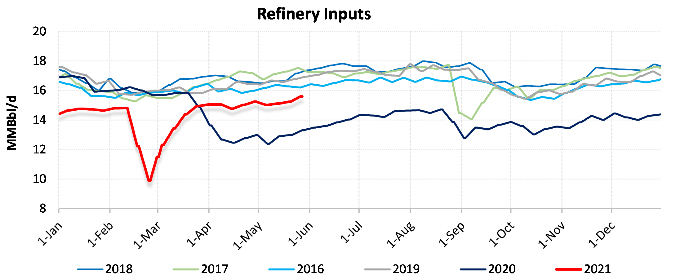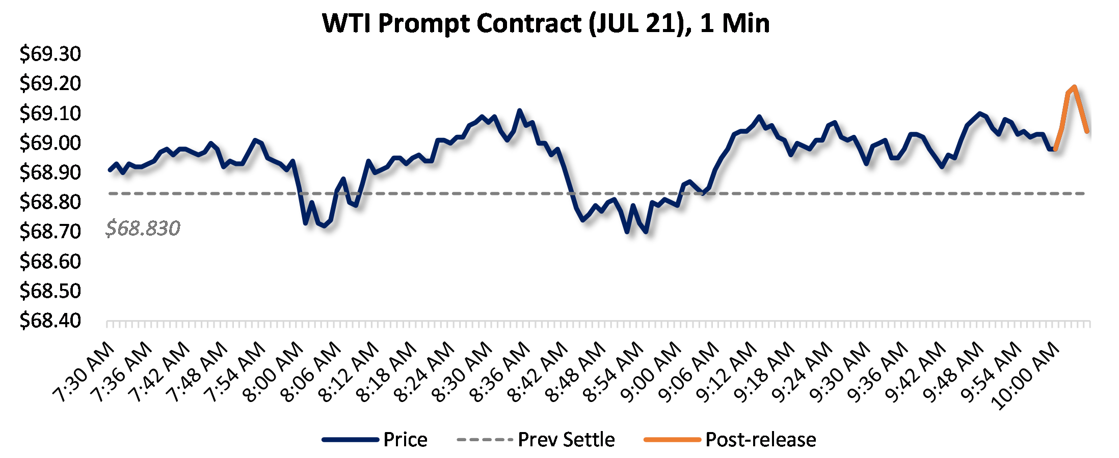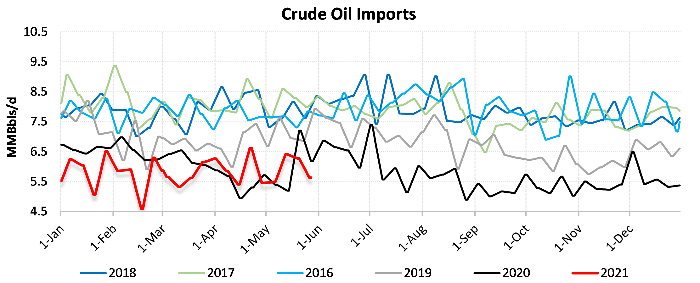 EIA reported a draw of -5079 MBbls in U.S. crude-oil inventories for the week ending 5/28/2021. This was larger than the average estimate of -2409 MBbls as reported by Bloomberg.