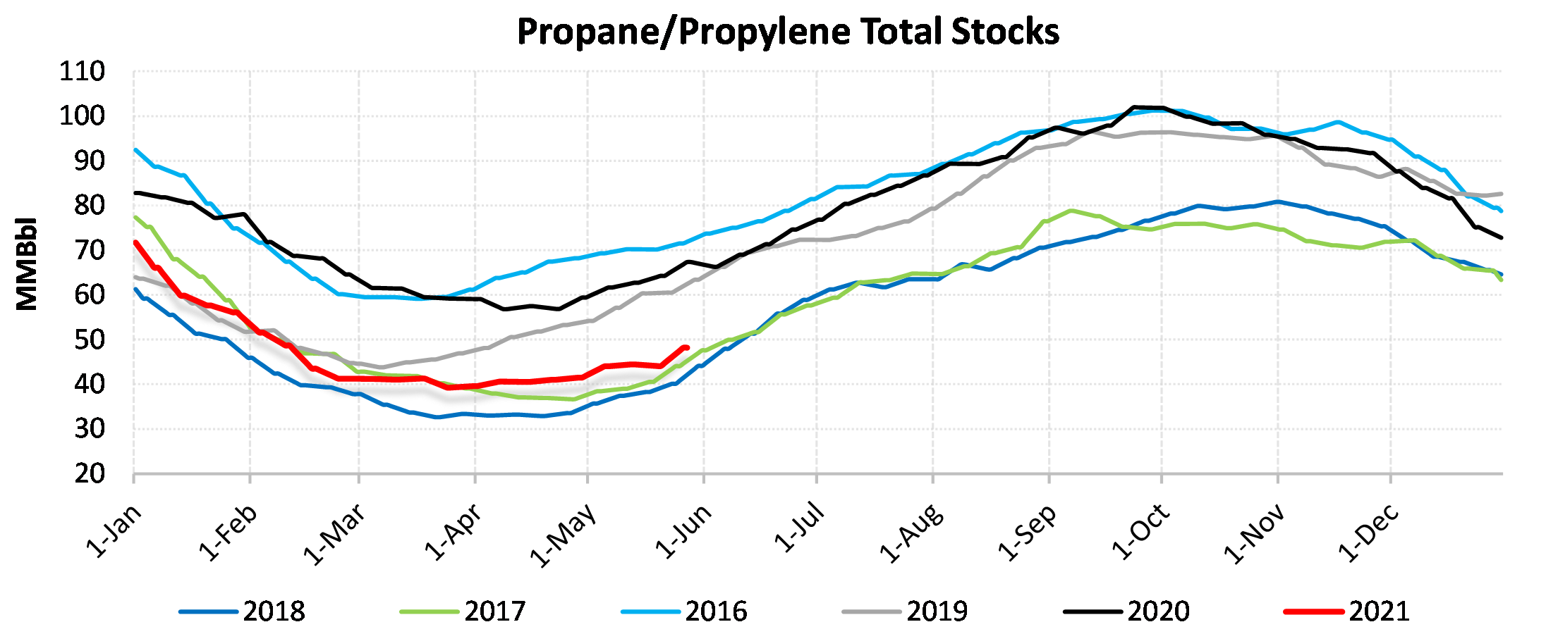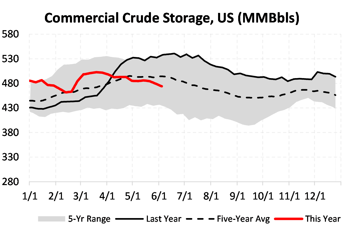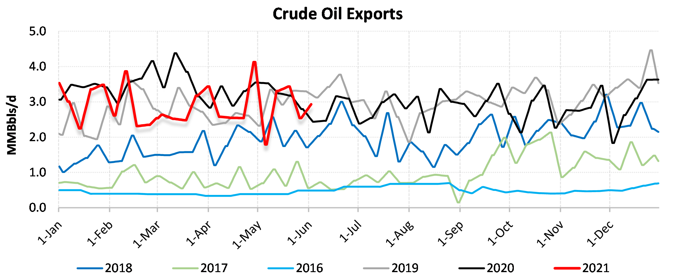 EIA reported a draw of -5241 MBbls in U.S. crude-oil inventories for the week ending 6/4/2021. This was larger than the average estimate of -2892 MBbls as reported by Bloomberg.