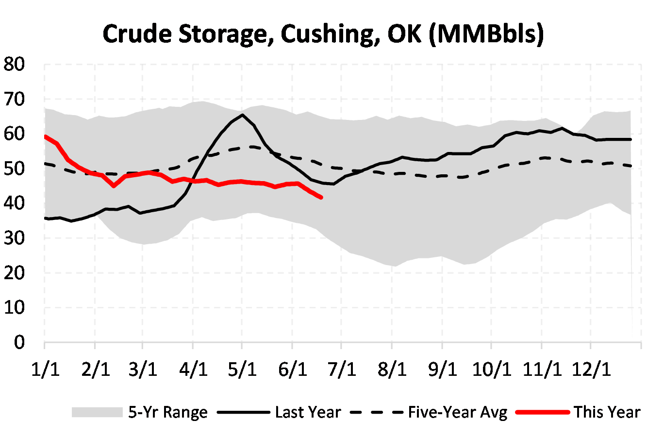 Inventories for the US are now at a deficit of 80.22 MBbls to last year and a deficit of 32.39 MBbls to the five-year average.