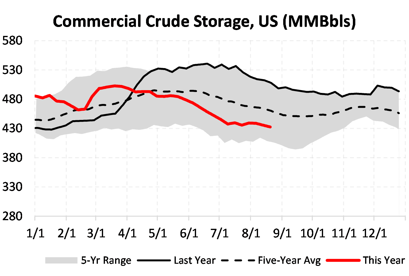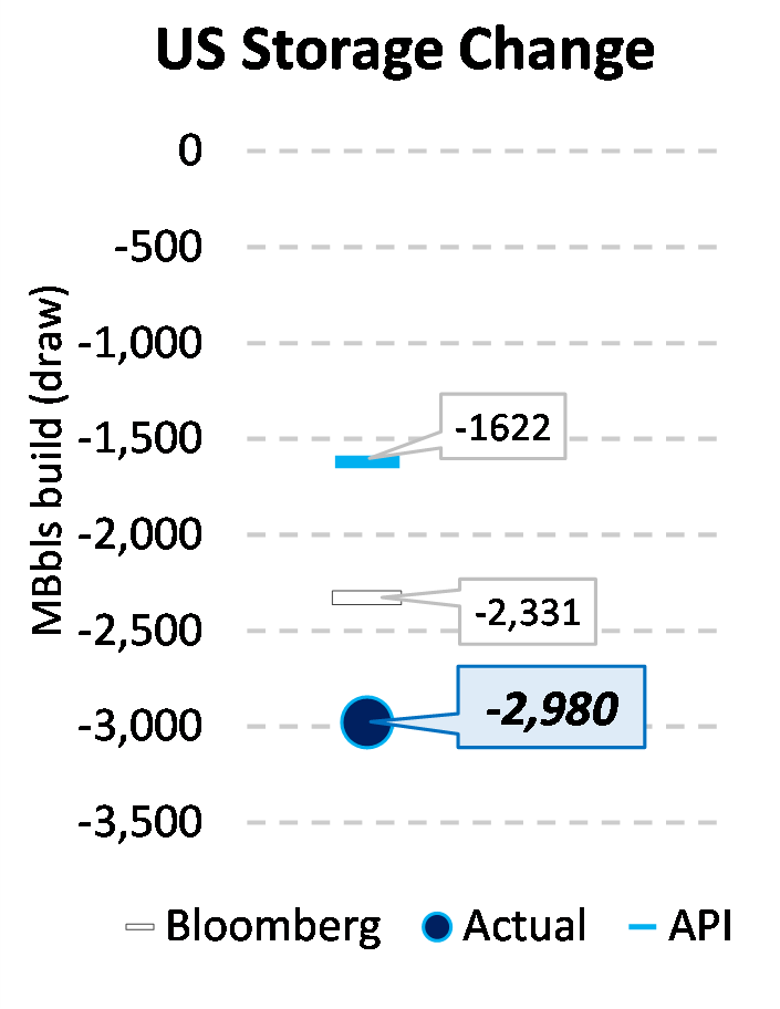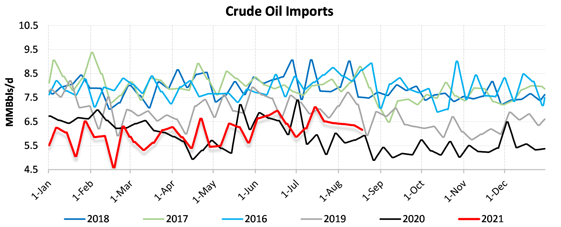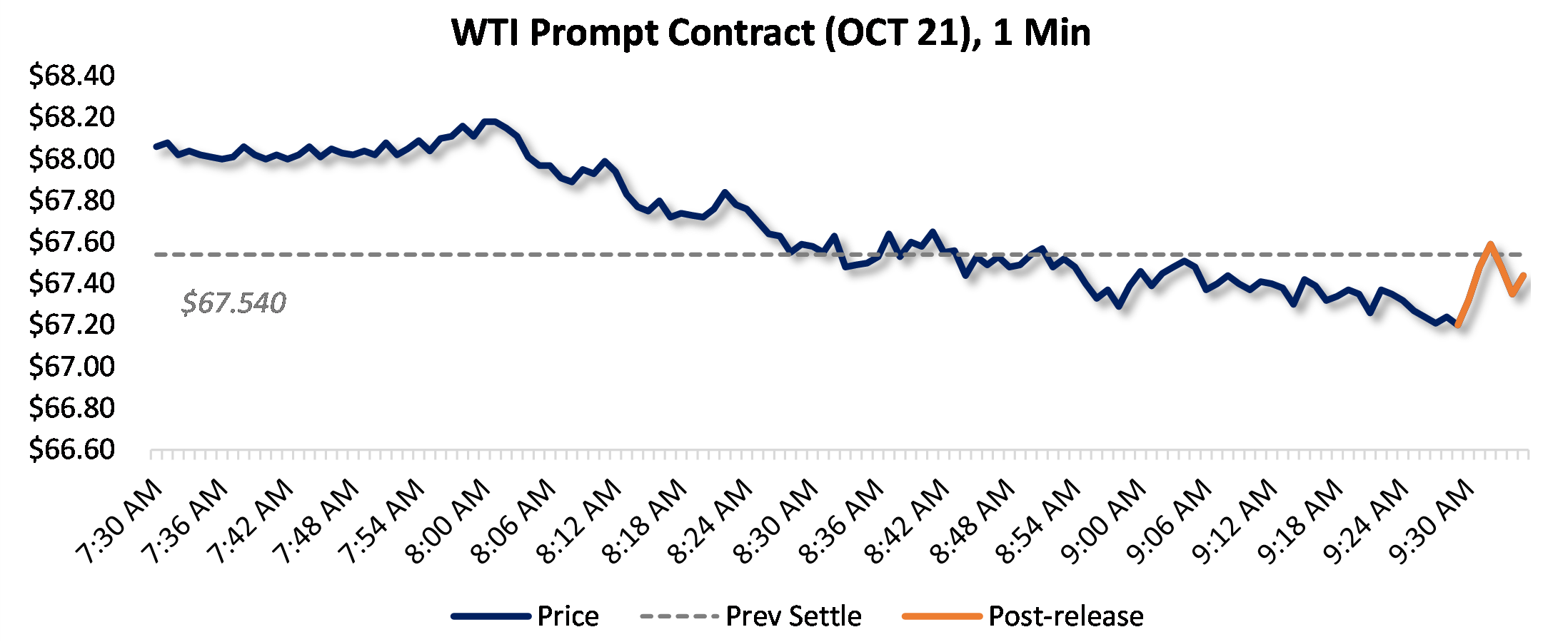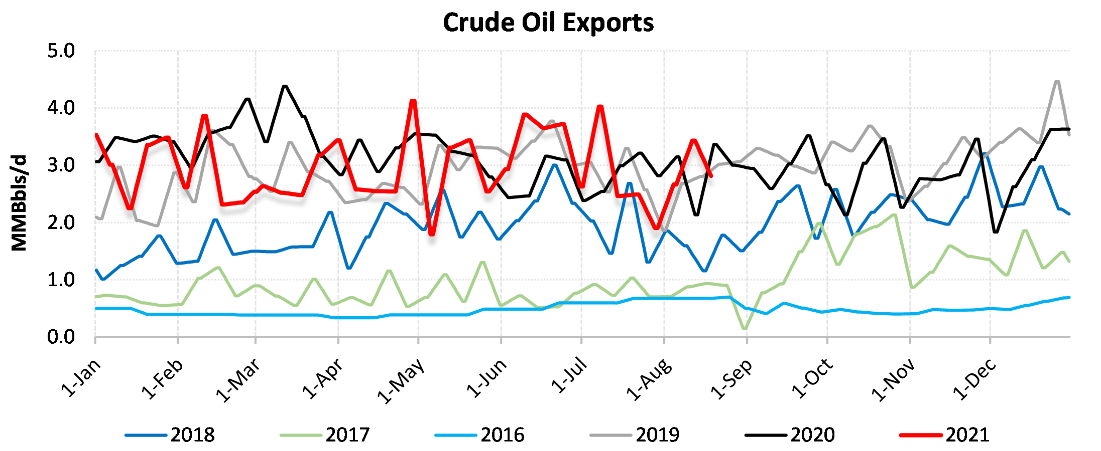 EIA reported a draw of -2980 MBbls in U.S. crude-oil inventories for the week ending 8/20/2021. This was larger than the average estimate of -2331 MBbls as reported by Bloomberg.