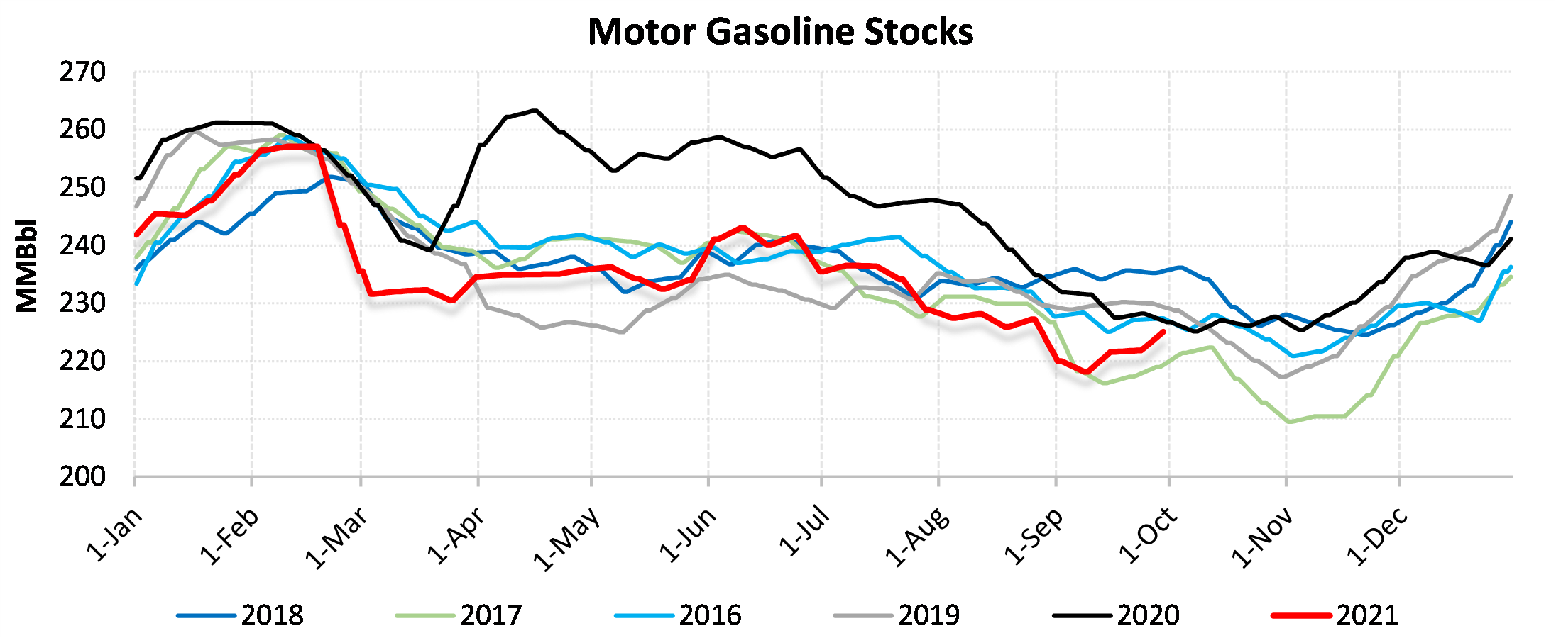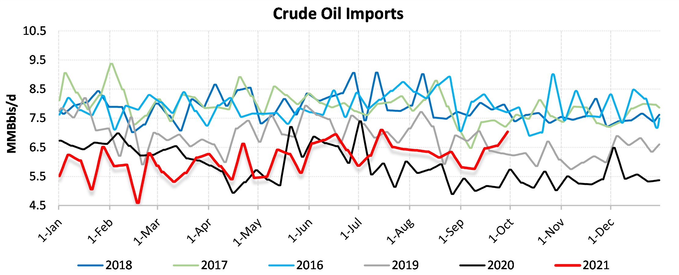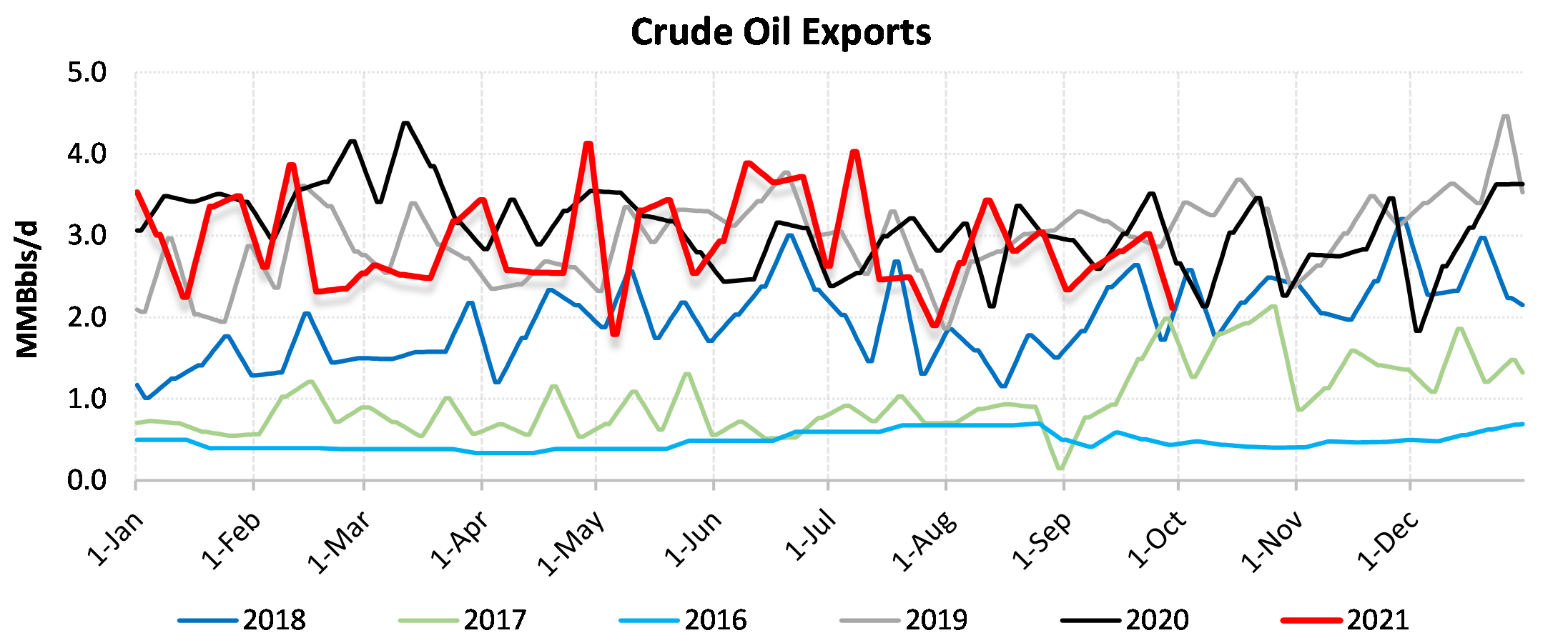 EIA reported a build of 2345 MBbls in U.S. crude-oil inventories for the week ending 10/1/2021. This was larger than the average estimate of 795 MBbls as reported by Bloomberg.