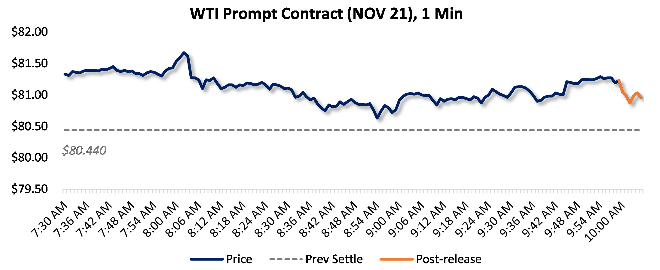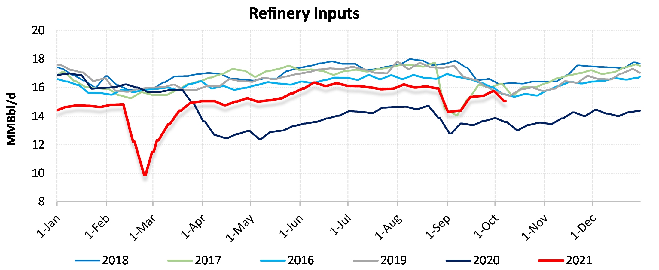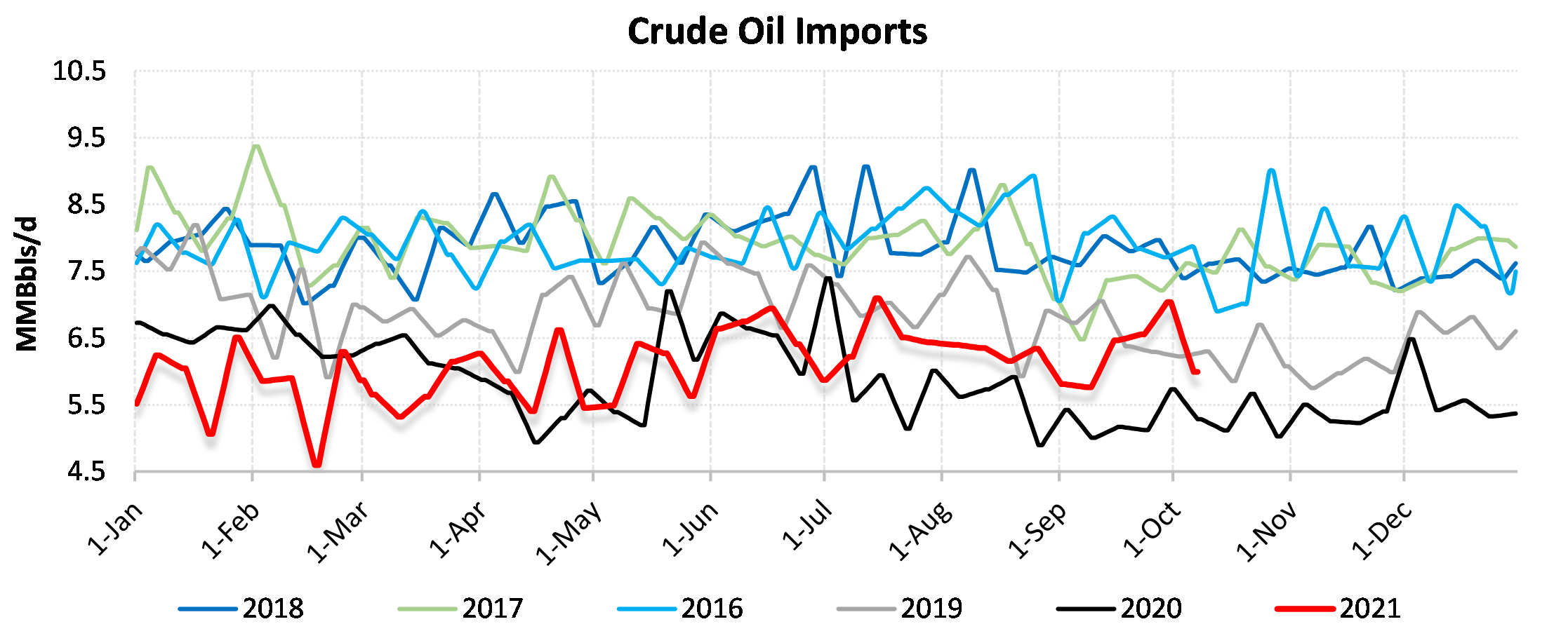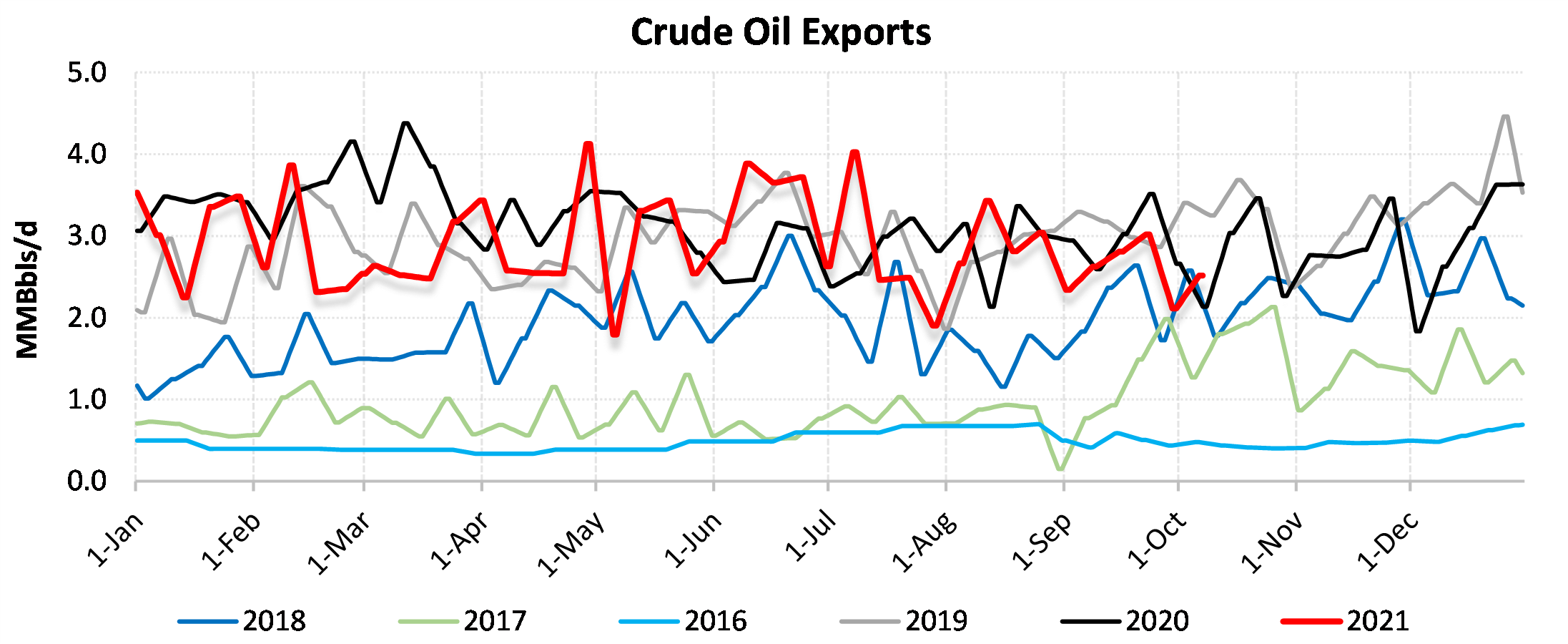 EIA reported a build of 6088 MBbls in U.S. crude-oil inventories for the week ending 10/8/2021. This was larger than the average estimate of 521 MBbls as reported by Bloomberg.