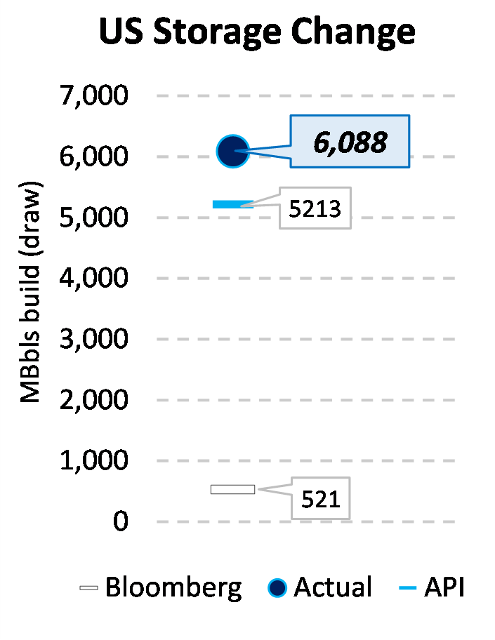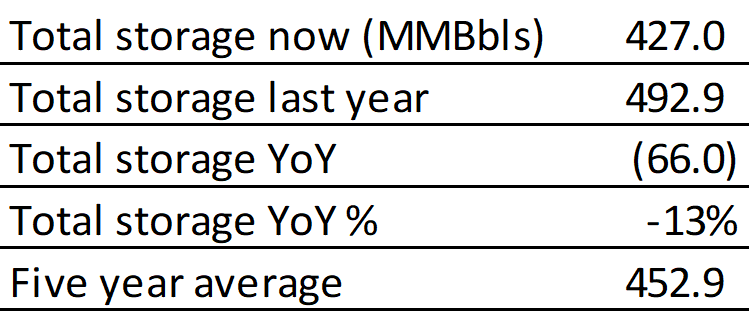 Inventories for the US are now at a deficit of 65.952 MBbls to last year and a deficit of 25.95 MBbls to the five-year average.