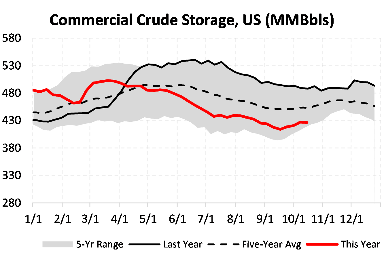 EIA reported a draw of -431 MBbls in U.S. crude-oil inventories for the week ending 10/15/2021. This was smaller than the average estimate of 1288 MBbls as reported by Bloomberg.