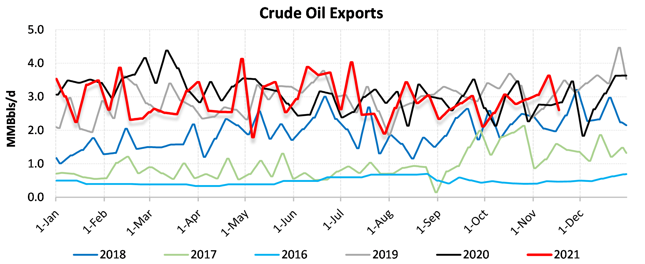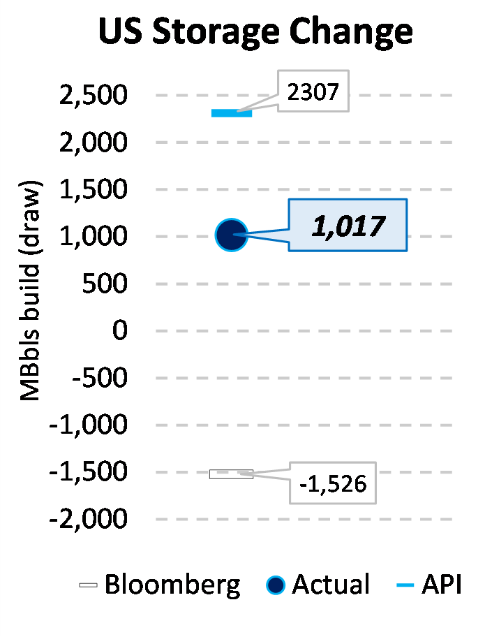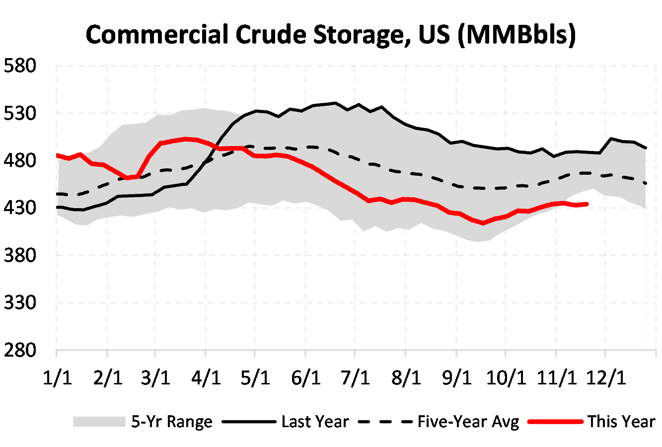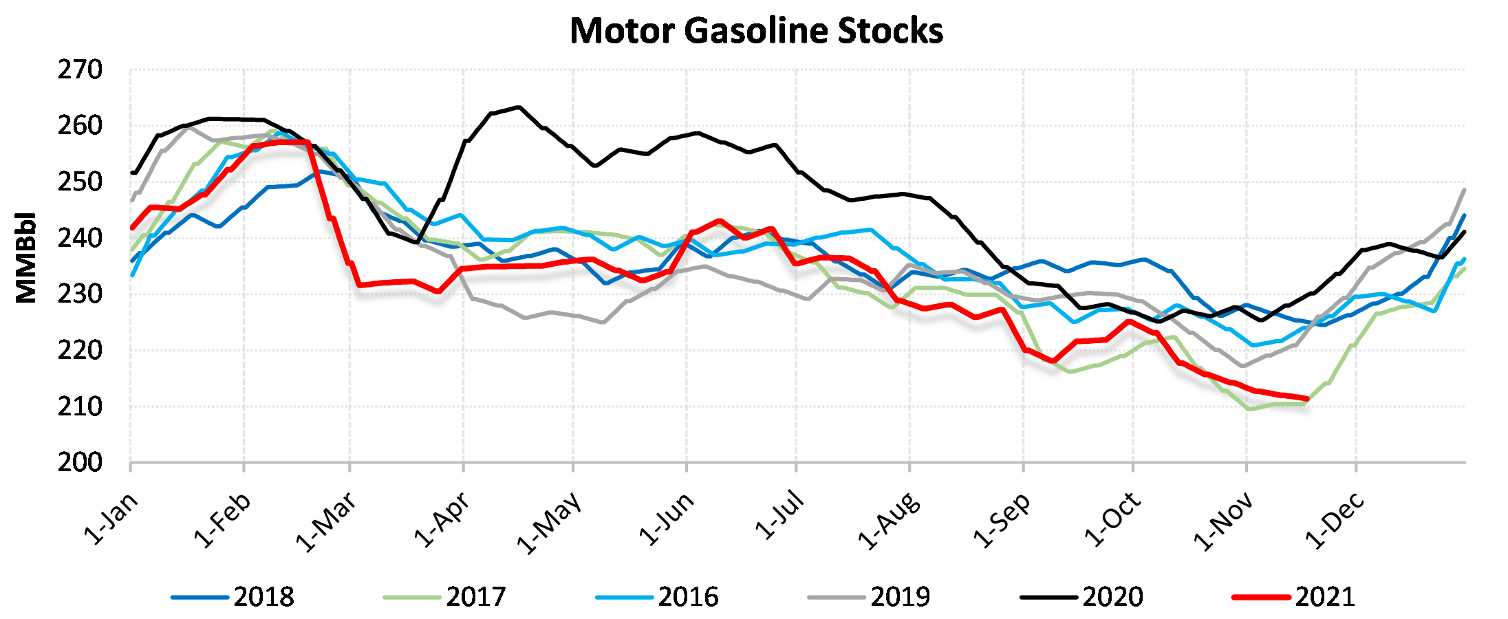 EIA reported a build of 1017 MBbls in U.S. crude-oil inventories for the week ending 11/19/2021. This was smaller than the average estimate of -1526 MBbls as reported by Bloomberg.