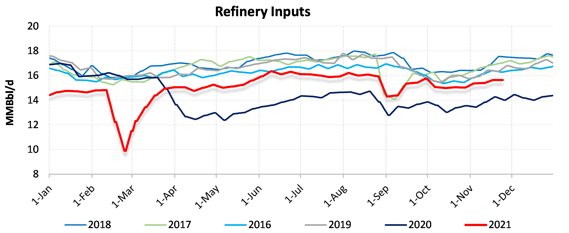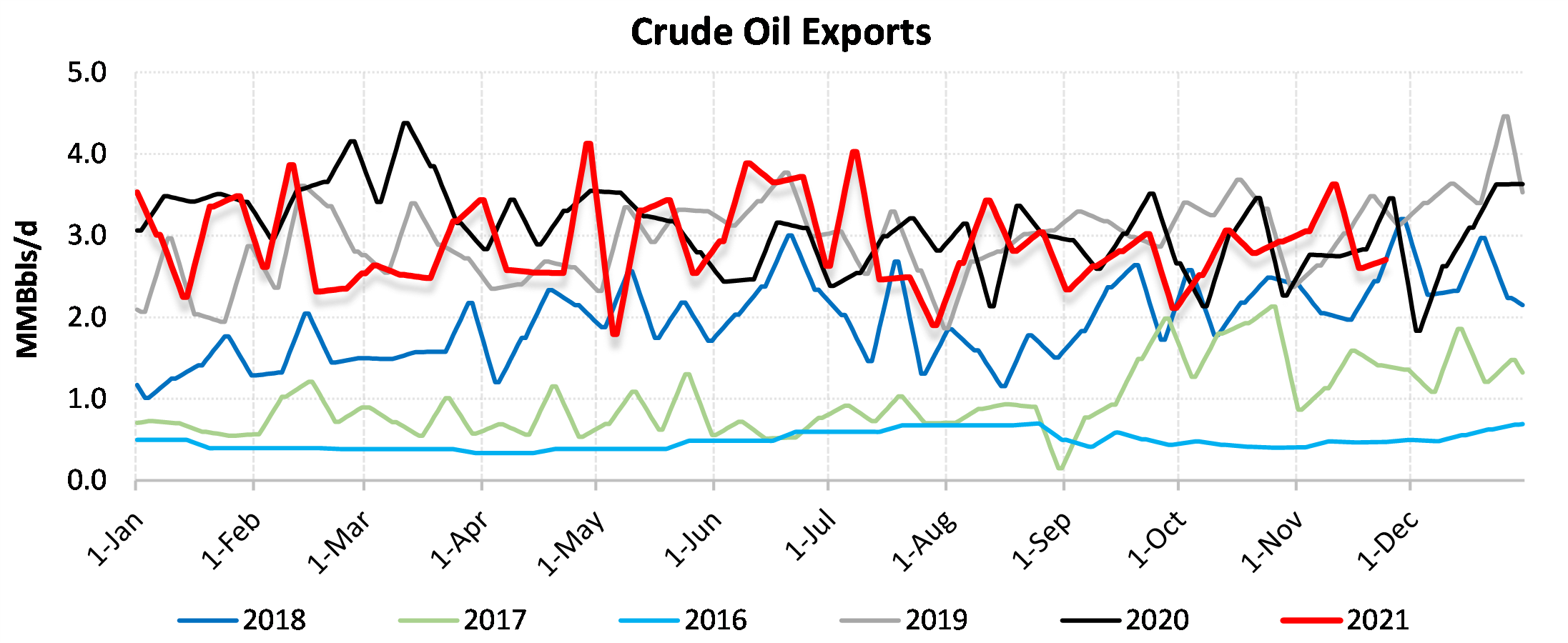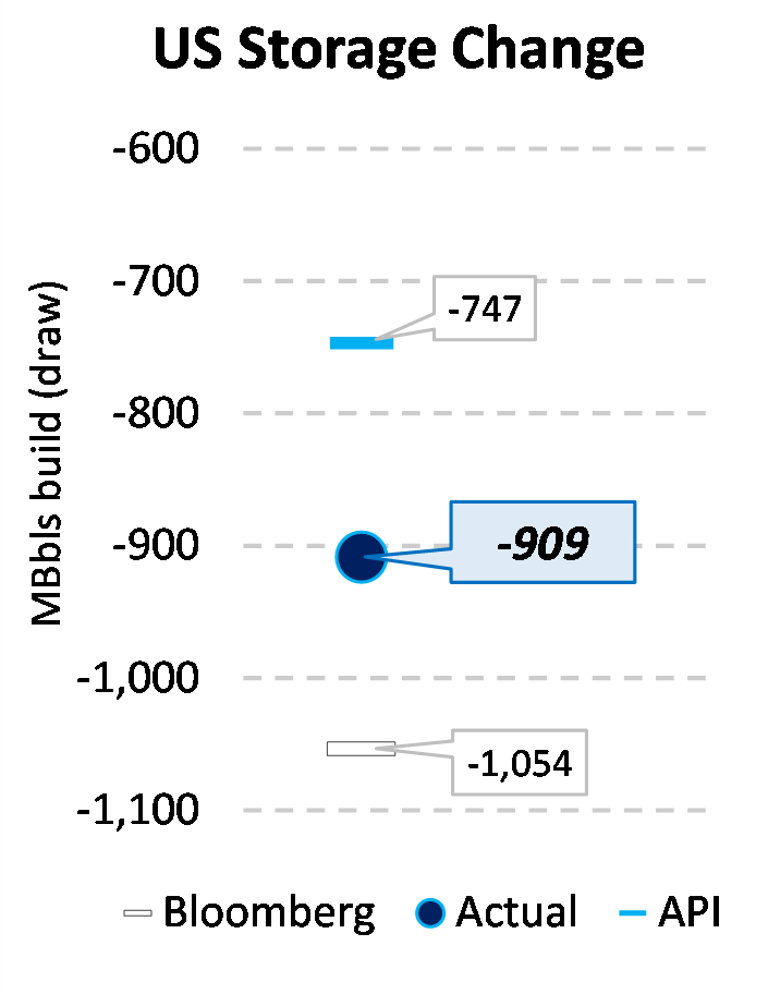 EIA reported a draw of -909 MBbls in U.S. crude-oil inventories for the week ending 11/26/2021. This was smaller than the average estimate of -1054 MBbls as reported by Bloomberg.
