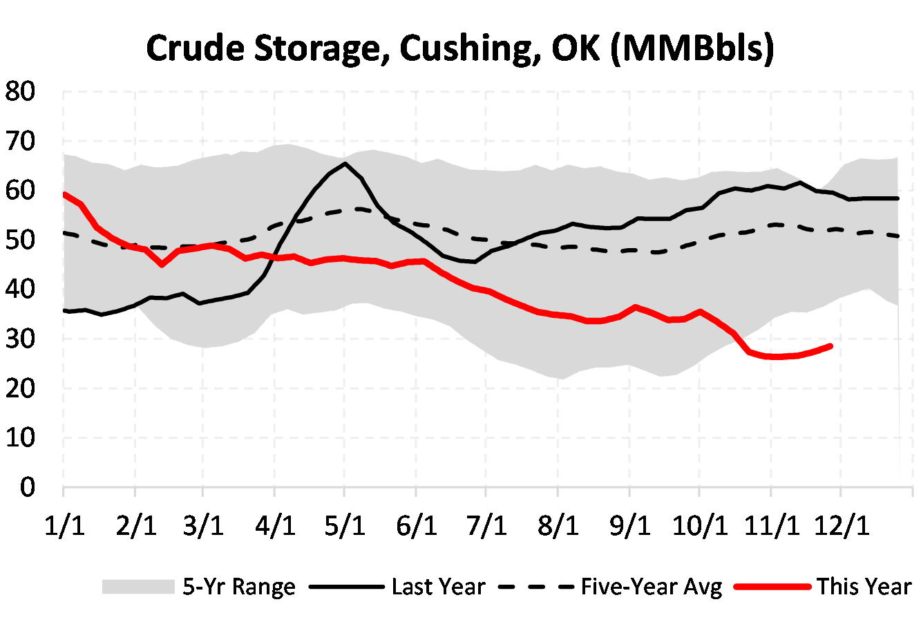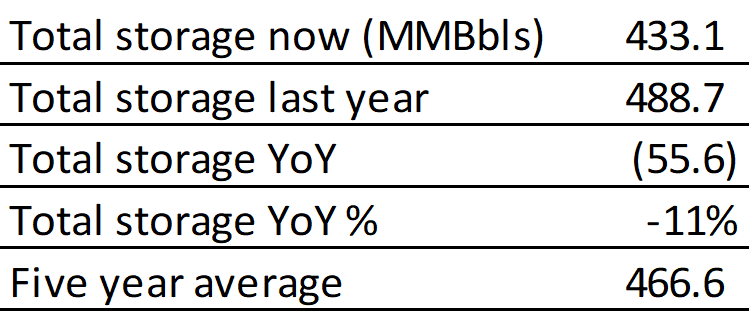Inventories for the US are now at a deficit of 55.61 MBbls to last year and a deficit of 33.49 MBbls to the five-year average.