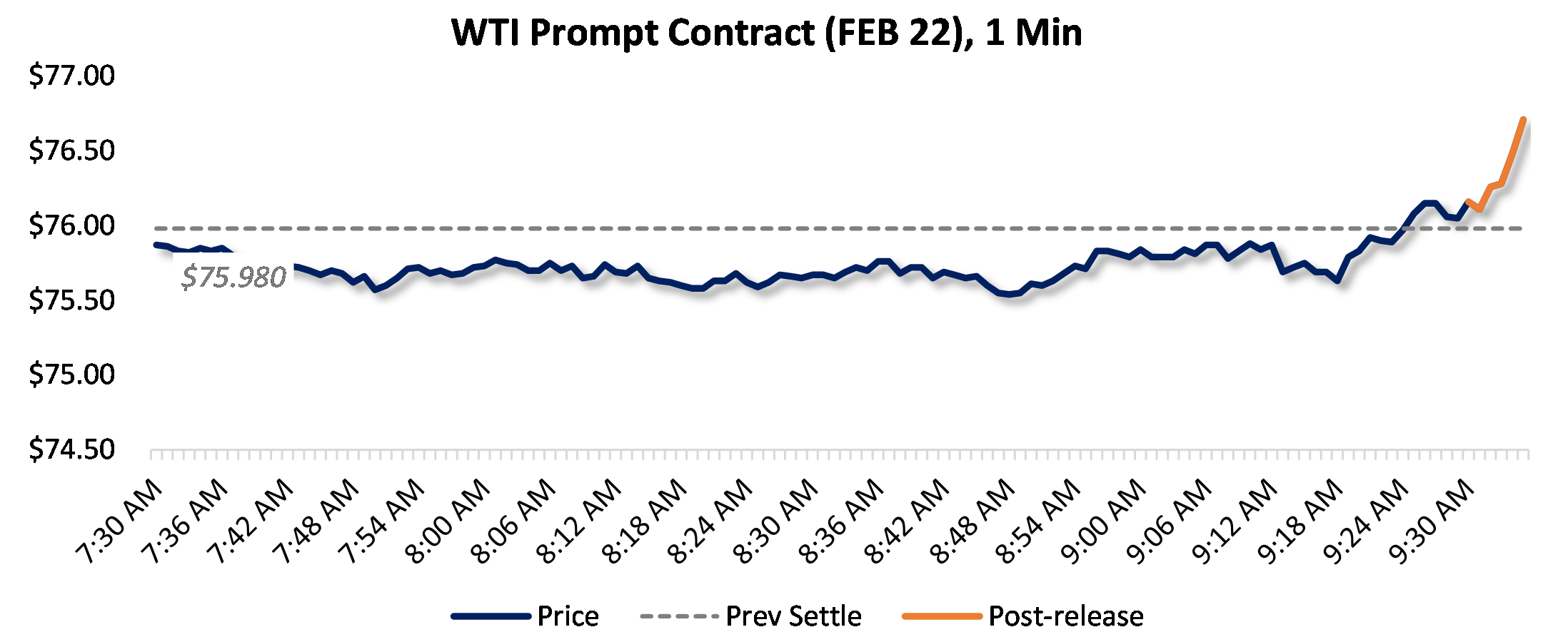Prices were up five minutes following the announcement, to $76.71, from $76.05 just before 9:30am.