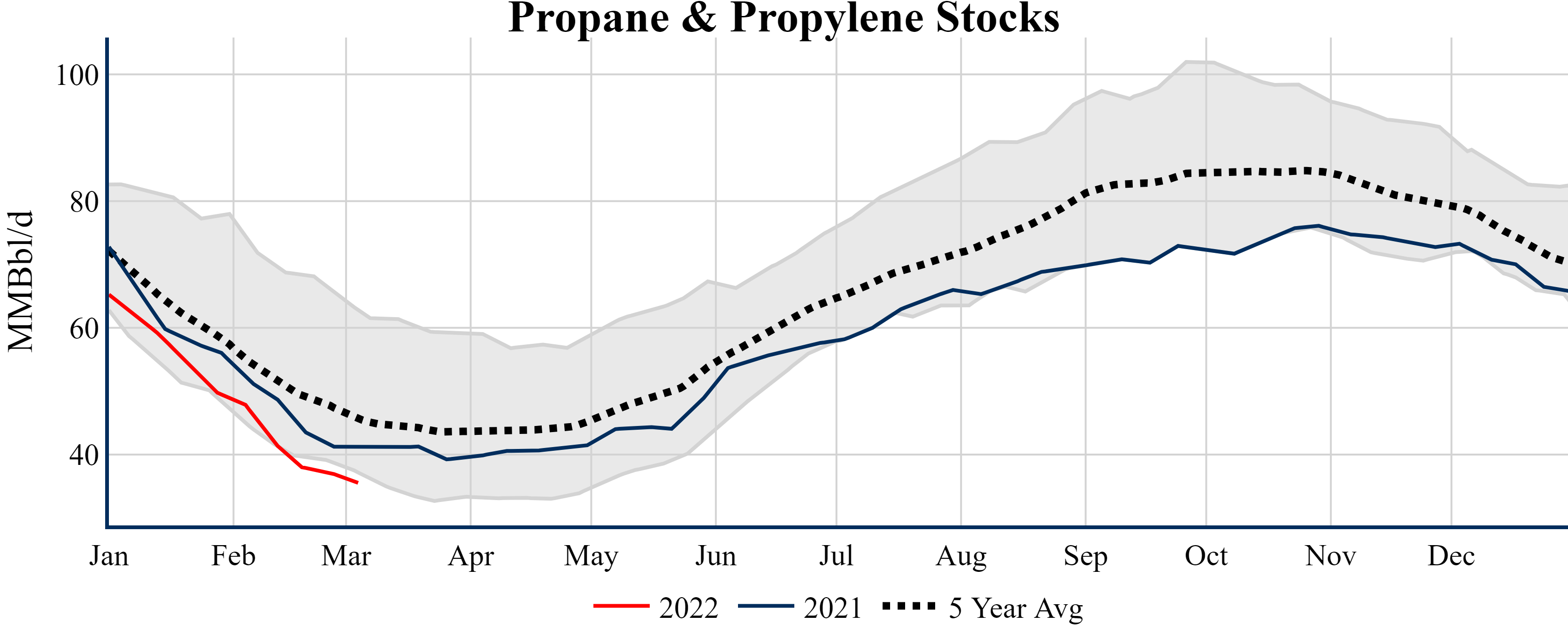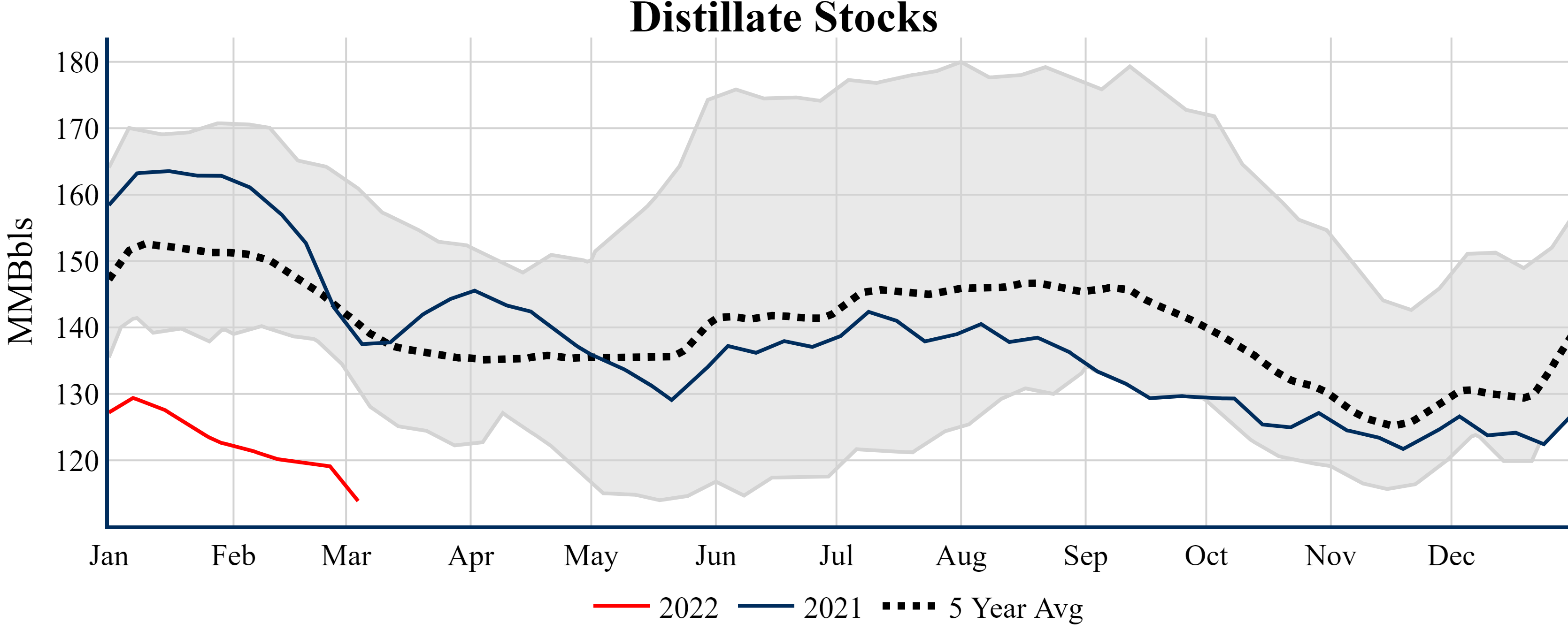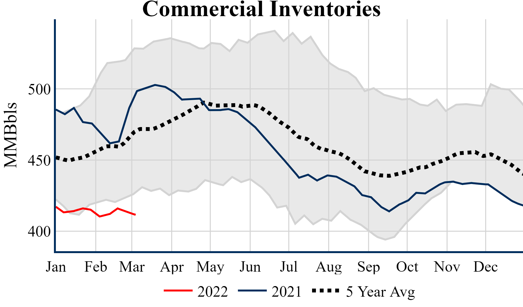 Inventories for the U.S. are now at a deficit of 84.90 MMBbls (-17.1%) to last year, and a deficit of 58.80 MMBbls (-12.5%) to the five-year average.