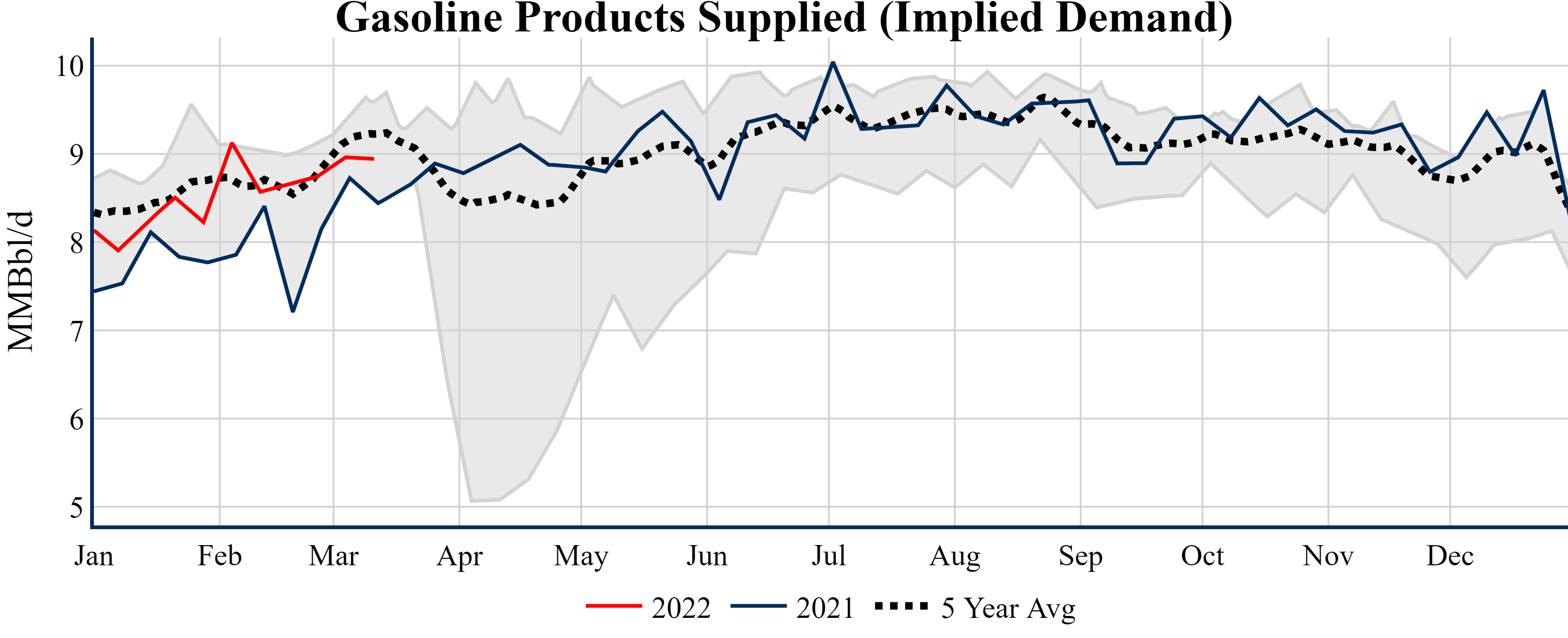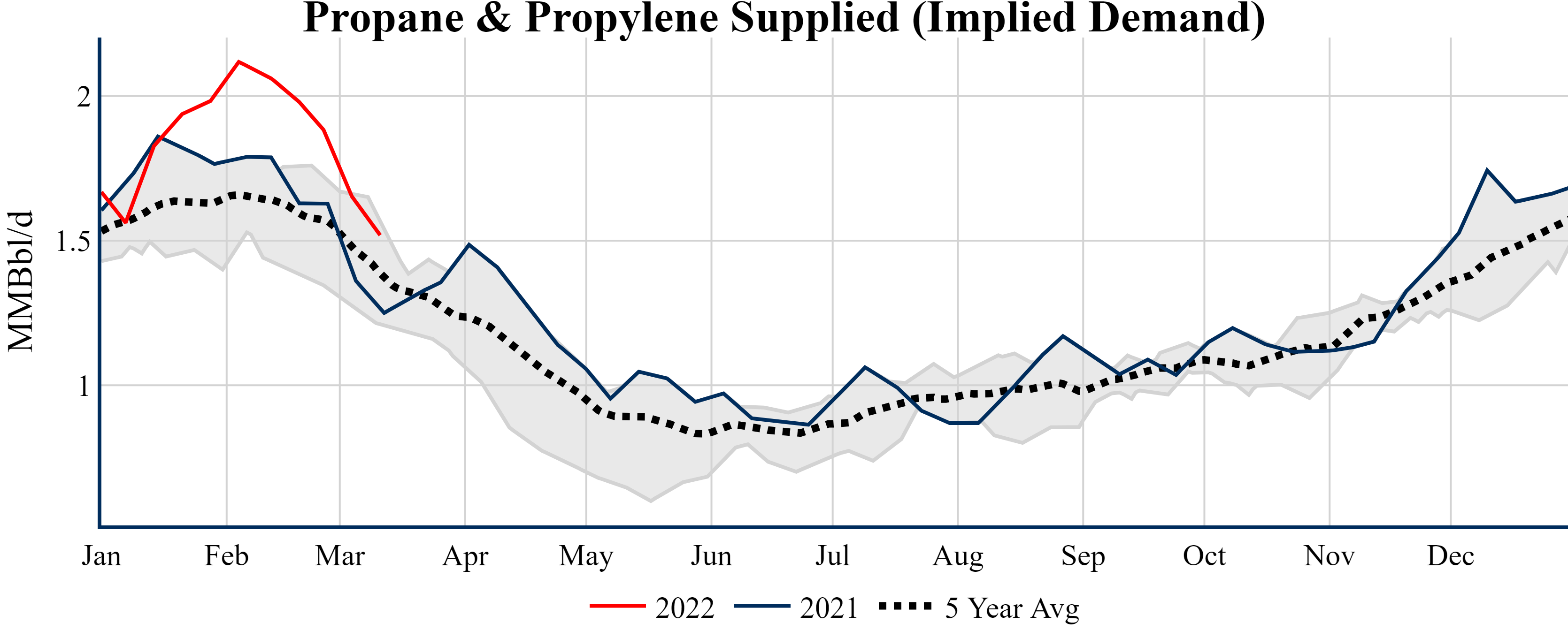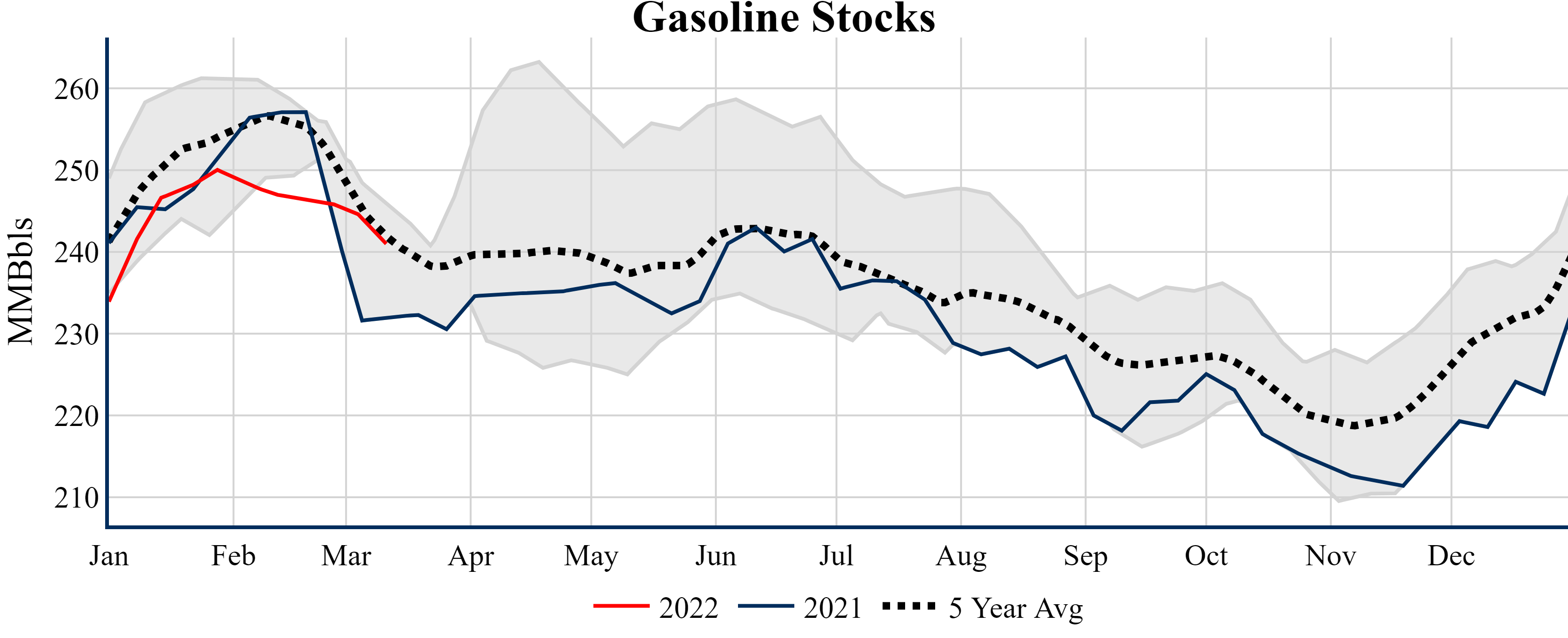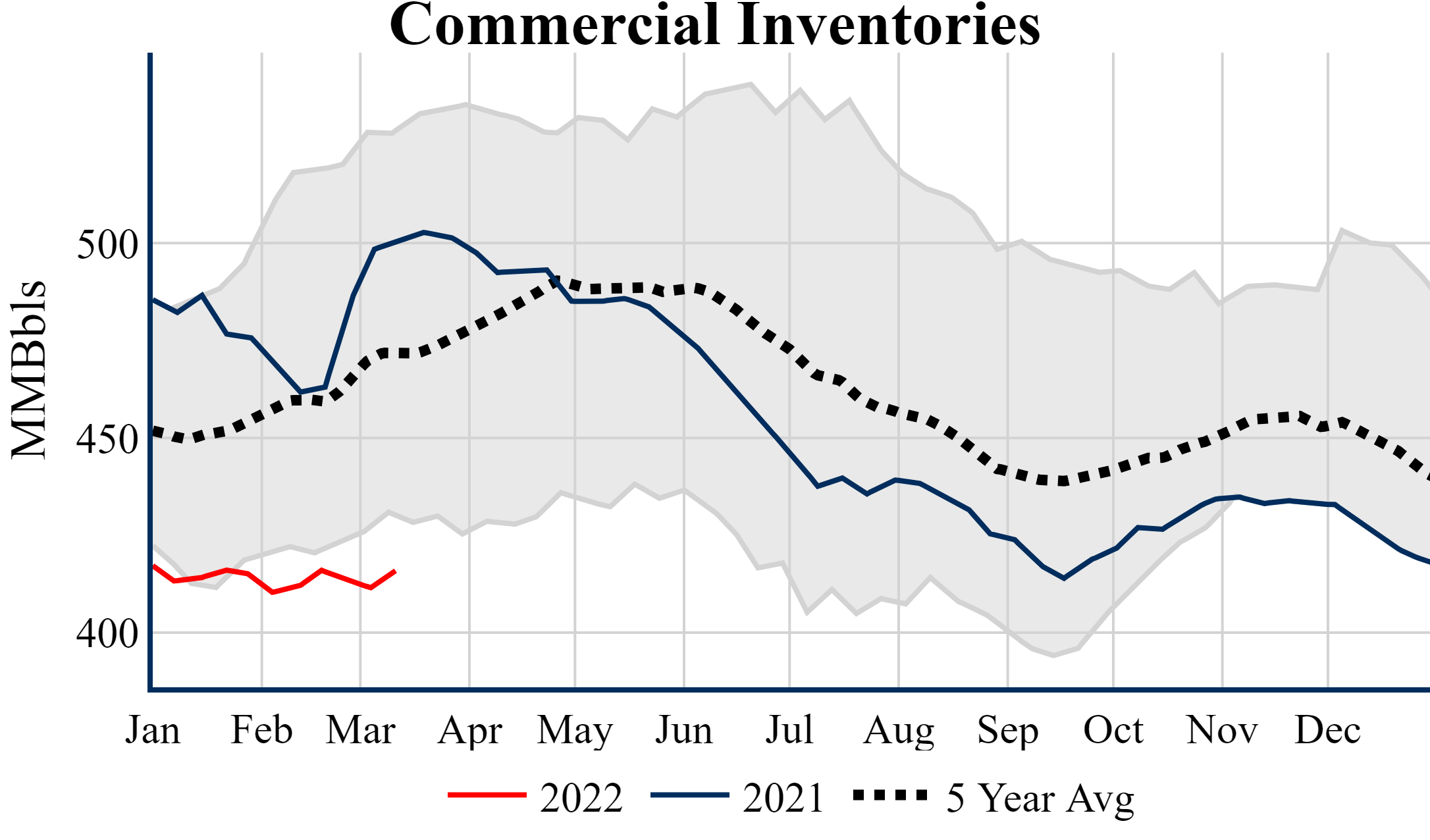 Inventories for the U.S. are now at a deficit of 84.50 MMBbls (-16.9%) to last year, and a deficit of 55.60 MMBbls (-11.8%) to the five-year average.