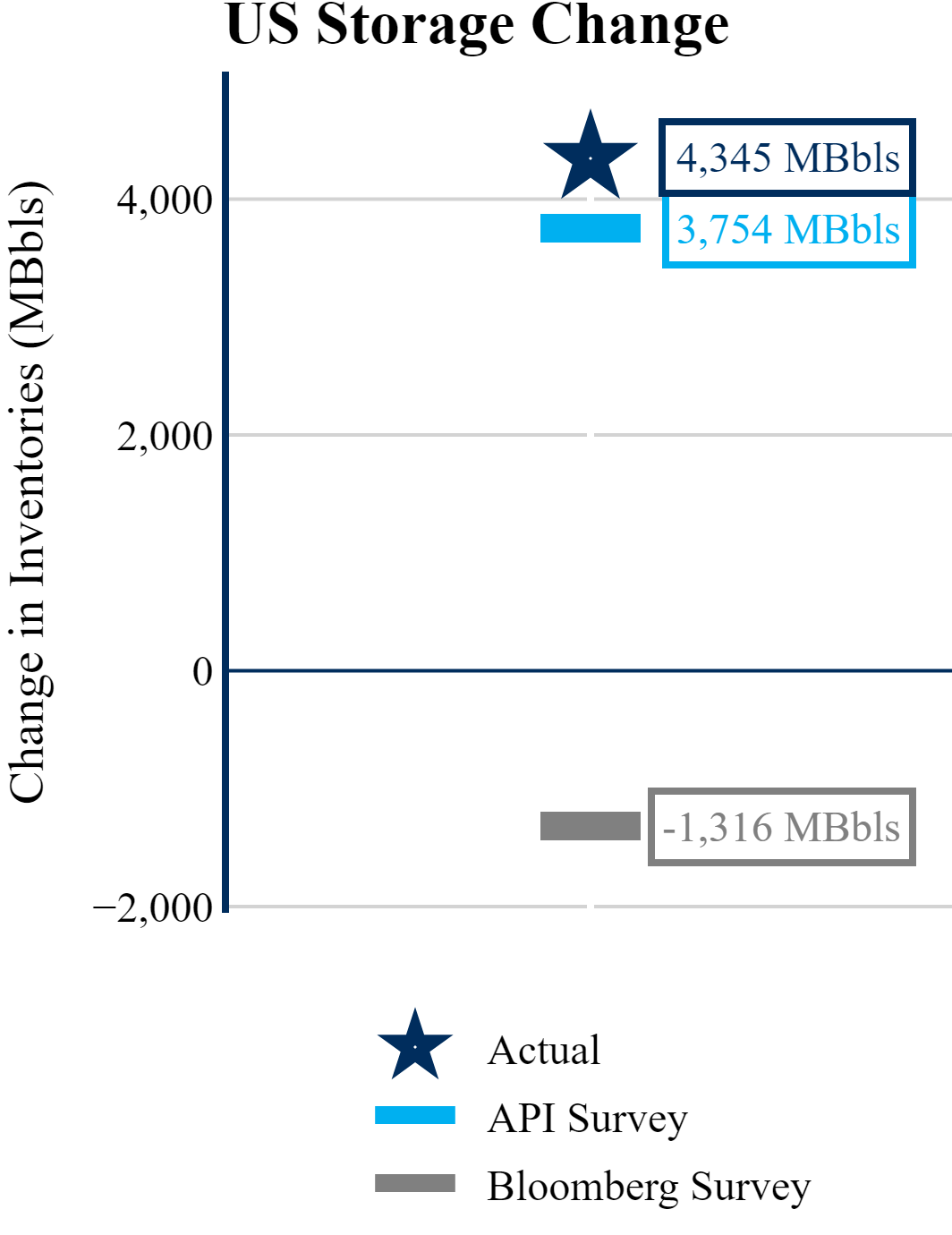 The EIA reported a build of 4,345 MBbls in U.S. crude-oil inventories. This build was larger than the average estimate of -1,316 MBbls as reported by Bloomberg.