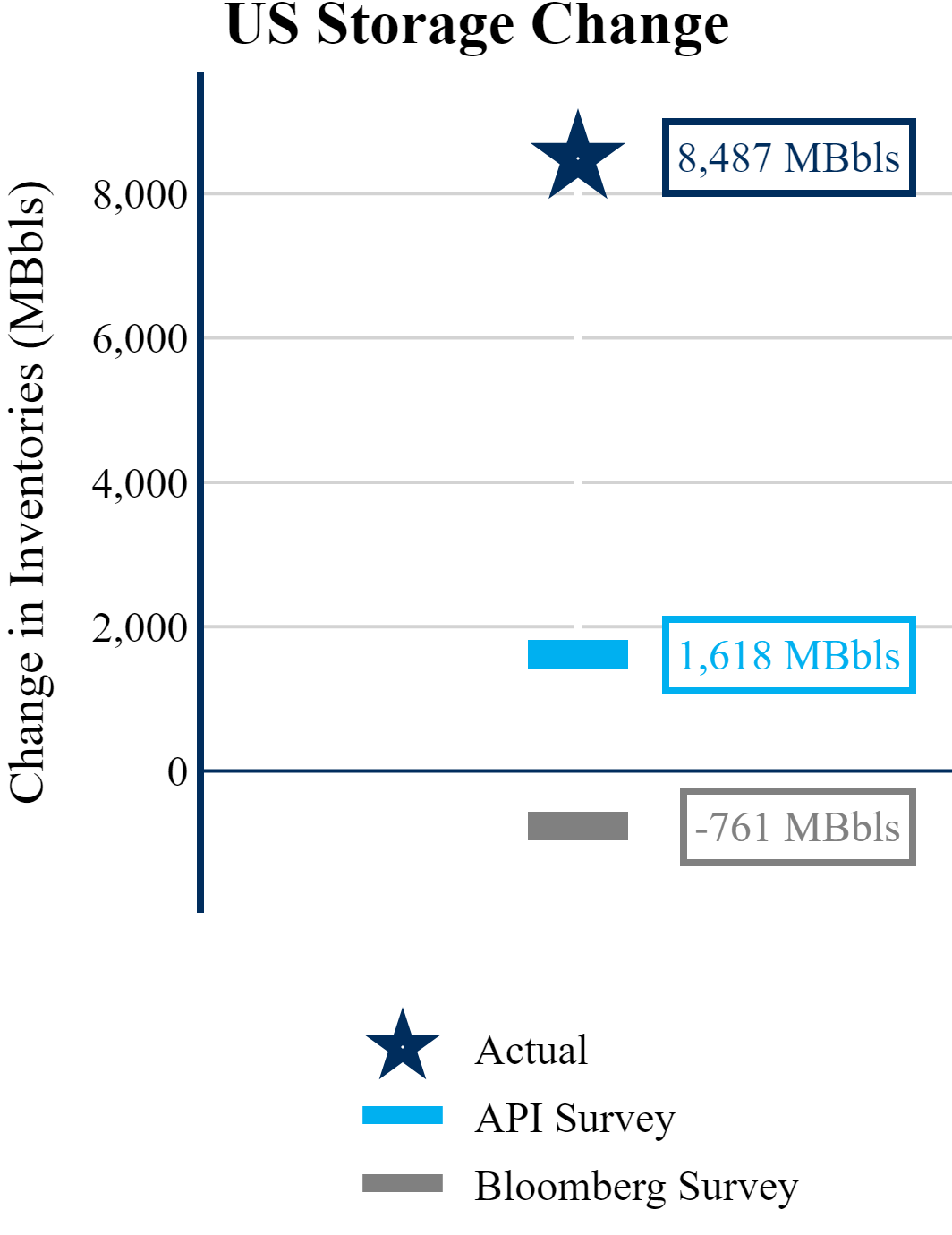 The EIA reported a build of +8,487 MBbls in U.S. crude-oil inventories. In contrast, the market expected a draw of -761 MBbls as reported by Bloomberg.