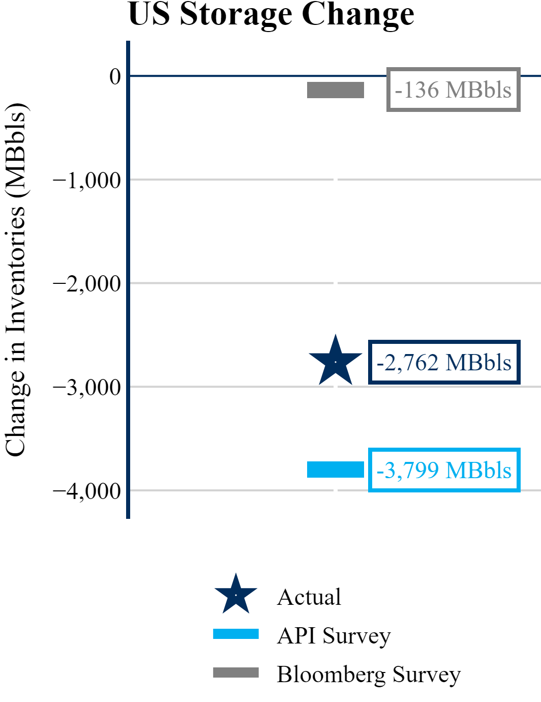 The EIA reported a draw of -2,762 MBbls in U.S. crude-oil inventories. The draw was larger than the average estimate of -136 as reported by Bloomberg.