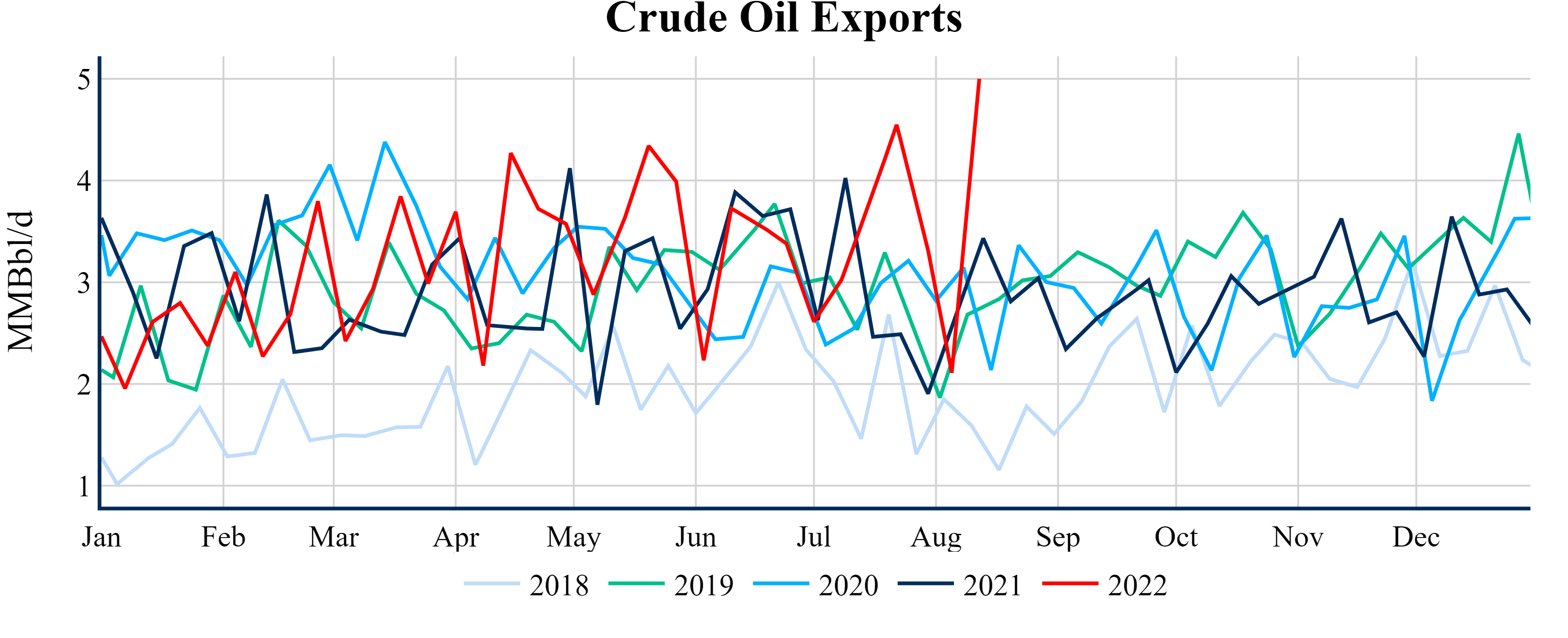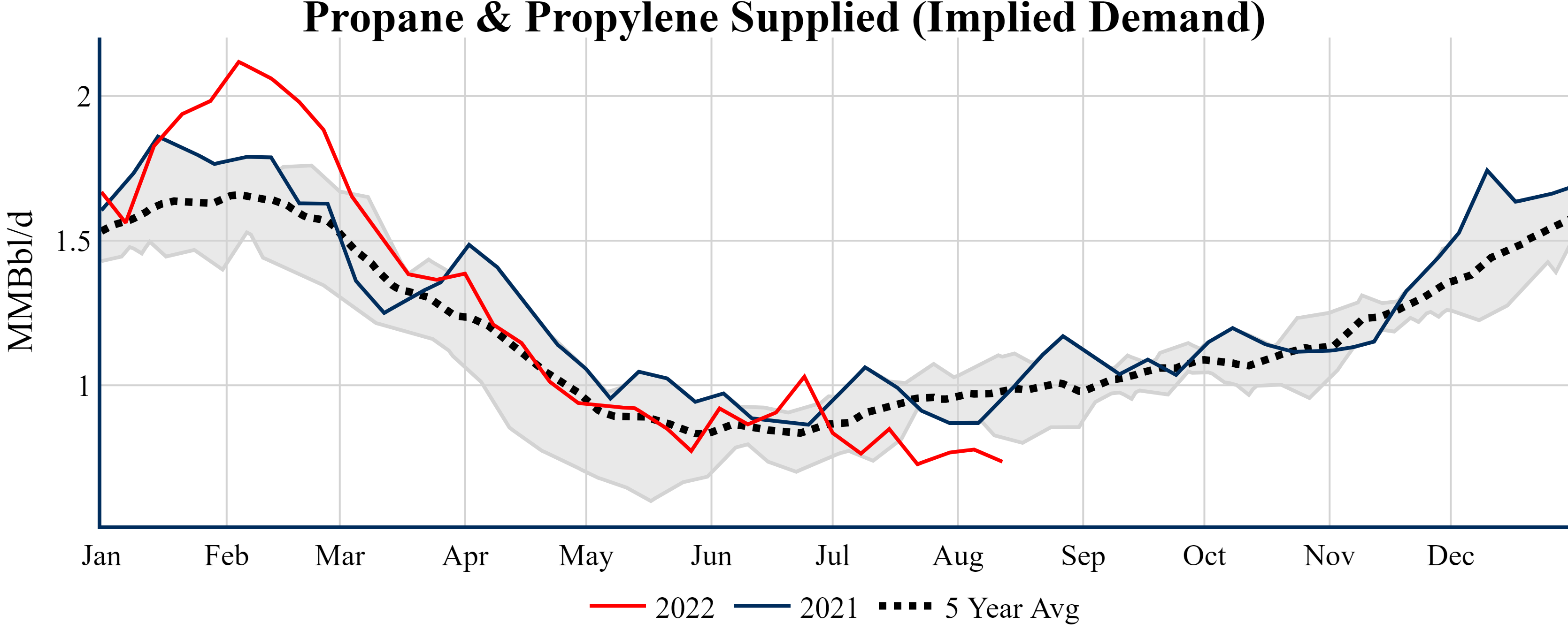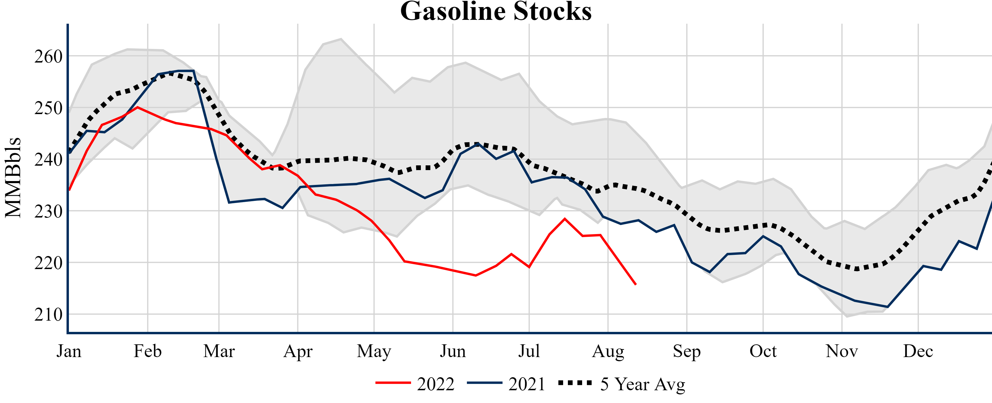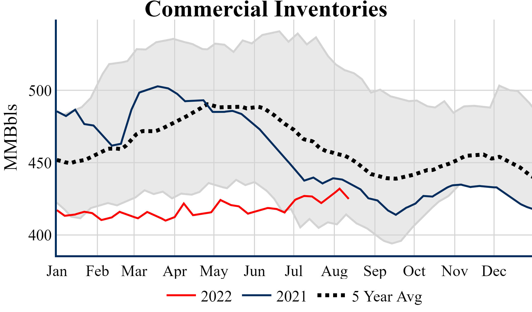 Inventories for the U.S. are now at a down of 11.10 MMBbls (-2.5%) to last year, and a deficit of 28.50 MMBbls (-6.3%) to the five-year average.