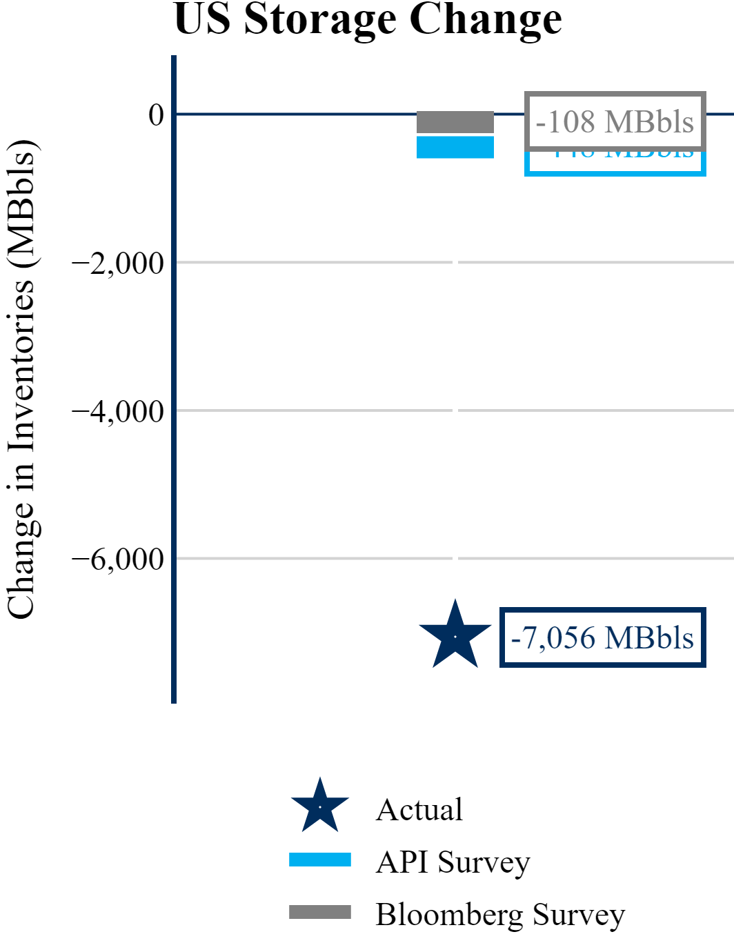The EIA reported a draw of -7,056 MBbls in U.S. crude-oil inventories. The draw was larger than the average estimate of -108 as reported by Bloomberg.