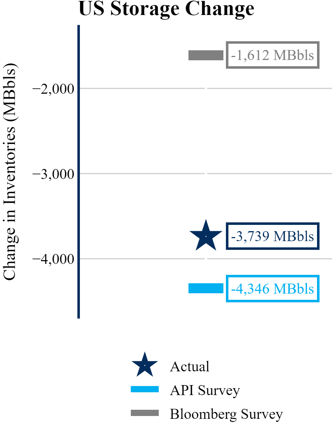 The EIA reported a draw of -3,739 MBbls in U.S. crude-oil inventories. The draw was smaller than the average estimate of -1,612 MBbls as reported by Bloomberg.