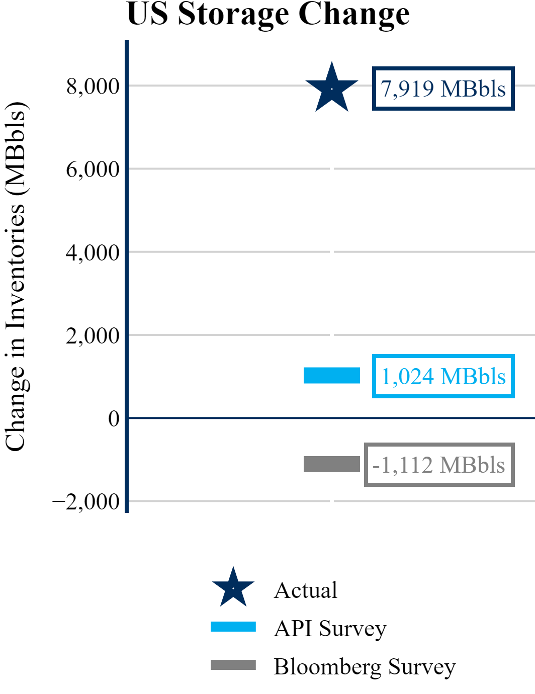 The EIA reported a build of +7,919 MBbls in U.S. crude-oil inventories. In contrast, the market expected a draw of -1,112 MBbls as reported by Bloomberg.