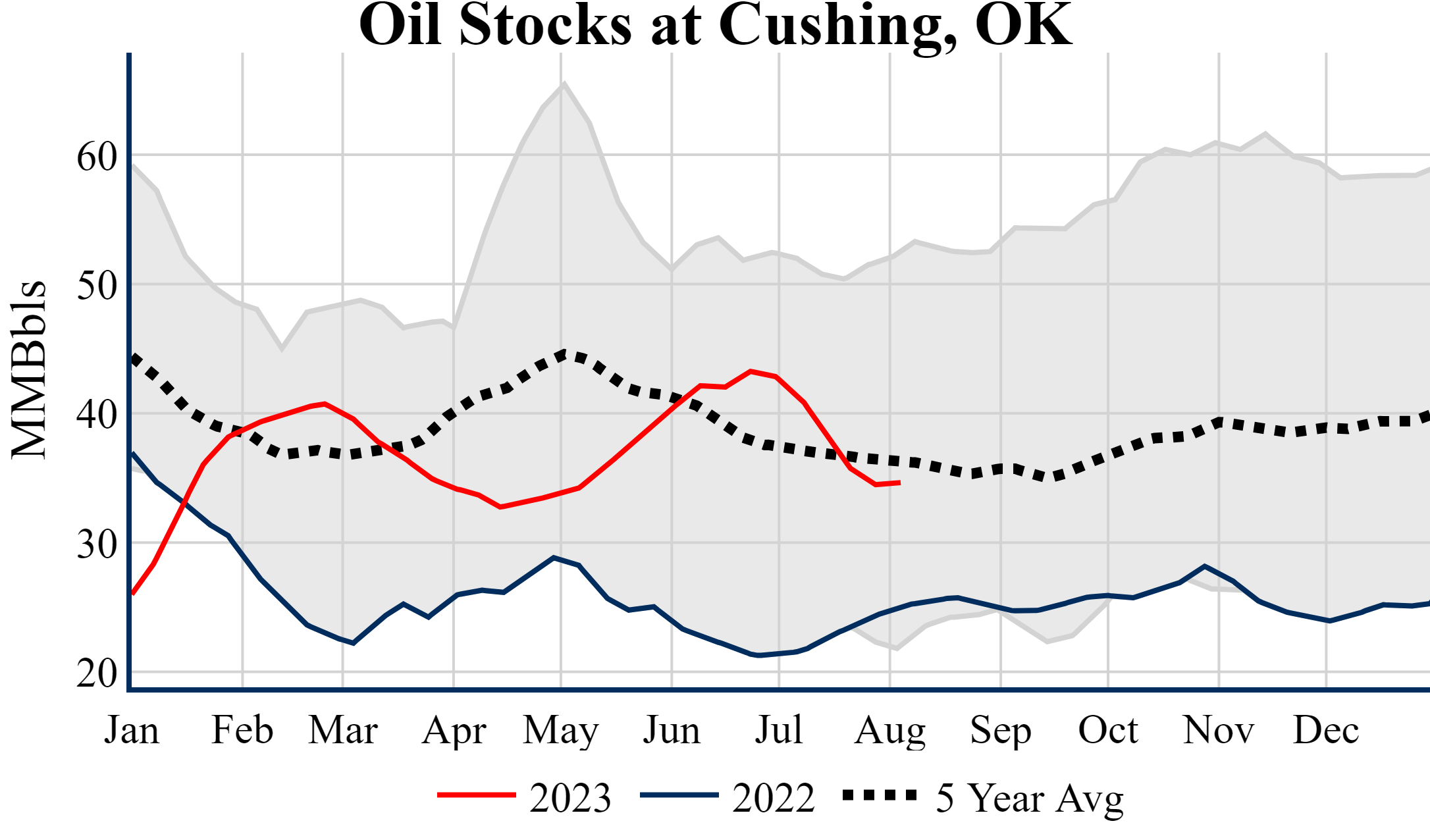 Inventories for the U.S. are now at a surplus of 14.40 MMBbls (3.3%) to last year, and a deficit of 1.30 MMBbls (-0.3%) to the five-year average.