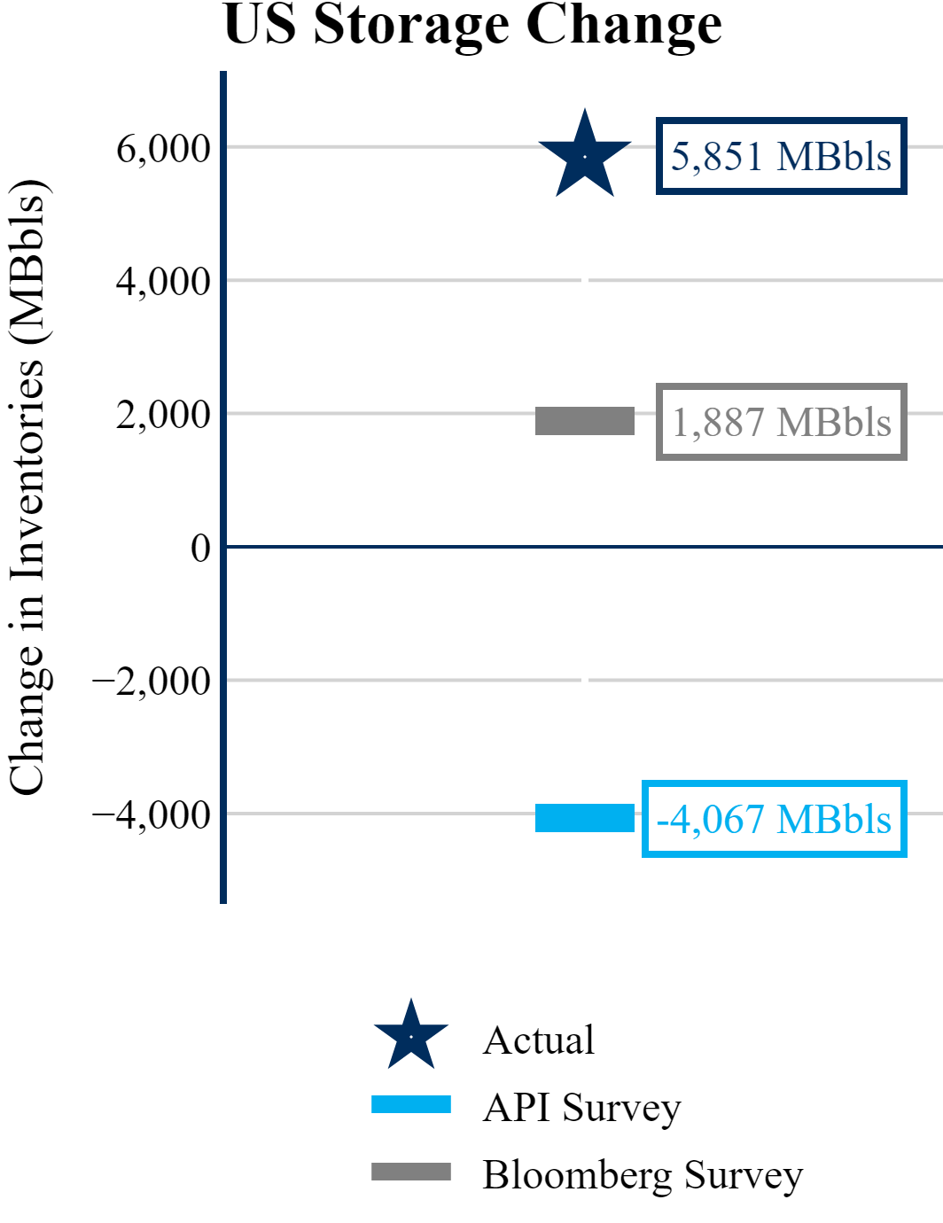 The EIA reported a build of +5,851 MBbls in U.S. crude-oil inventories. The build was larger than the average estimate of +1,887 as reported by Bloomberg.