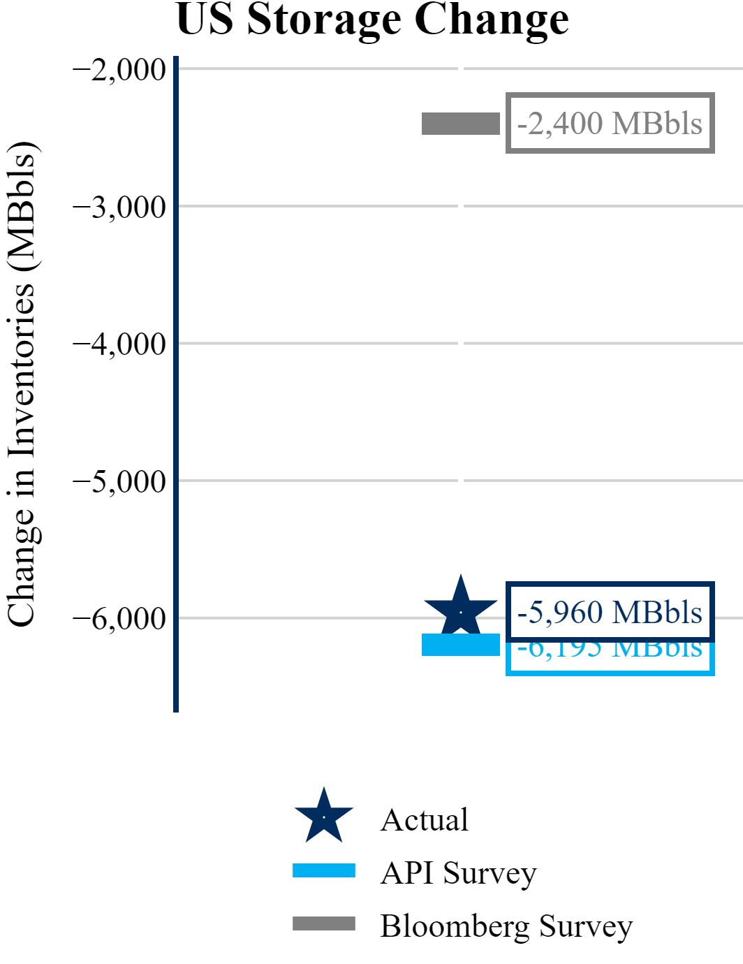 The EIA reported a draw of -5,960 MBbls in U.S. crude-oil inventories. The draw was larger than the average estimate of -2,400 as reported by Bloomberg.