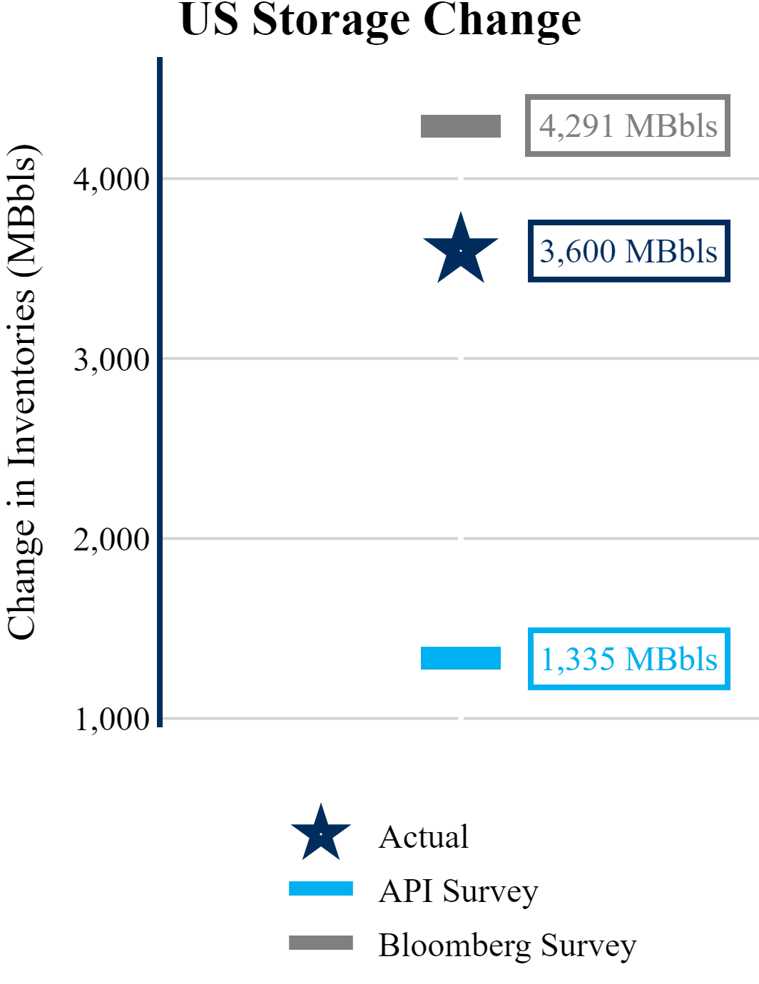 The EIA reported a build of +3,600 MBbls in U.S. crude-oil inventories. The build was smaller than the average estimate of +4,291 as reported by Bloomberg.