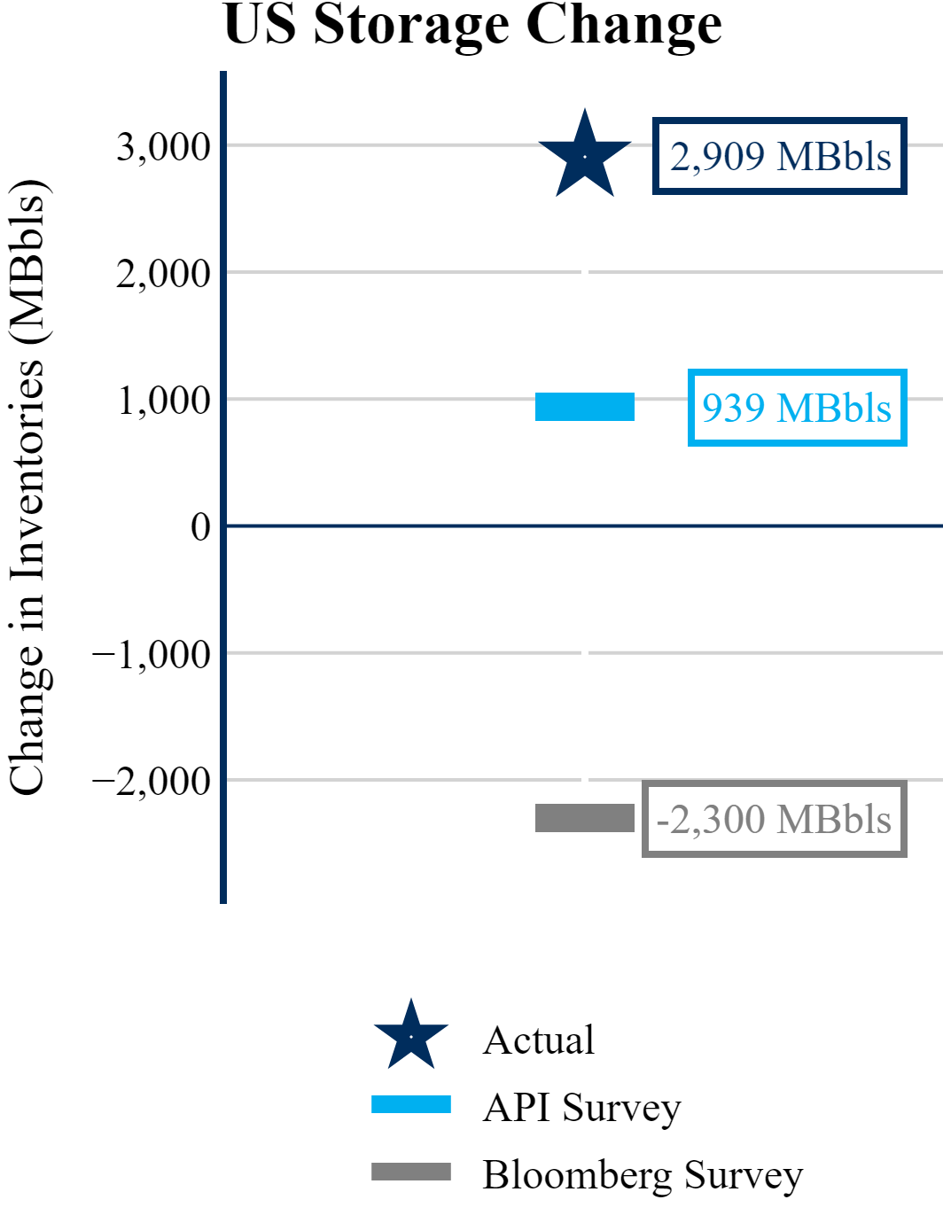 The EIA reported a build of +2,909 MBbls in U.S. crude-oil inventories. In contrast, the market expected a draw of -2,300 MBbls as reported by Bloomberg.